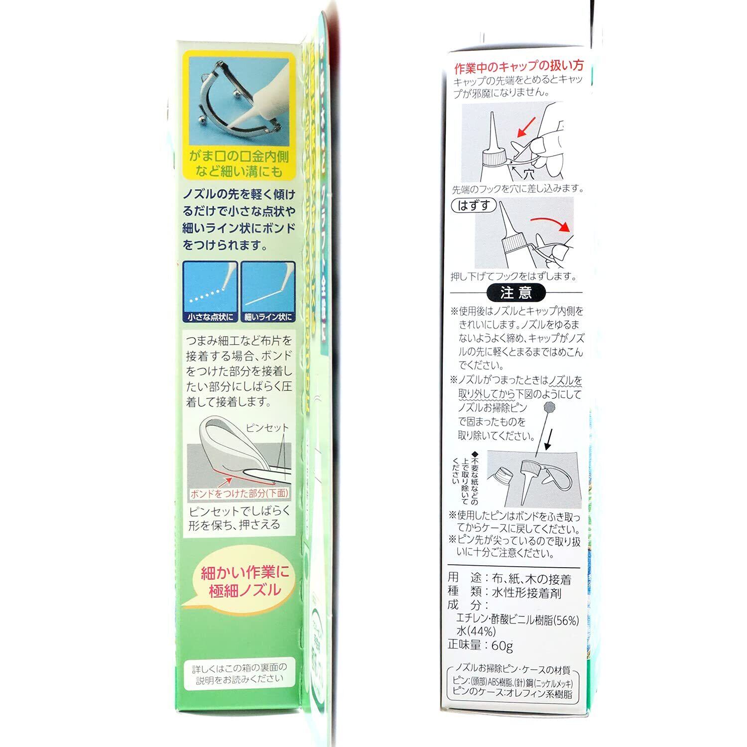 ●極細で使いやすいノズルなので、小さい点や細いライン状の部分づけに便利です。●ノズルお掃除ピン付き。●<こだわりポイント>●▼粘着性ガアップ●▼片手で操作しやすいソフトブローボトル…ボンドの量や出し方を細かく調整できます。●▼乾いた後の仕上がりがきれい…乾いた後は透明になり、目立ちにくいので、作品の仕上がりがきれいになります。●<接着時間の目安>●▼接着後30分以上で仮固定、24時間で完全接着します。(ただし、接着する素材、ボンドの使用量や使用環境により異なります)