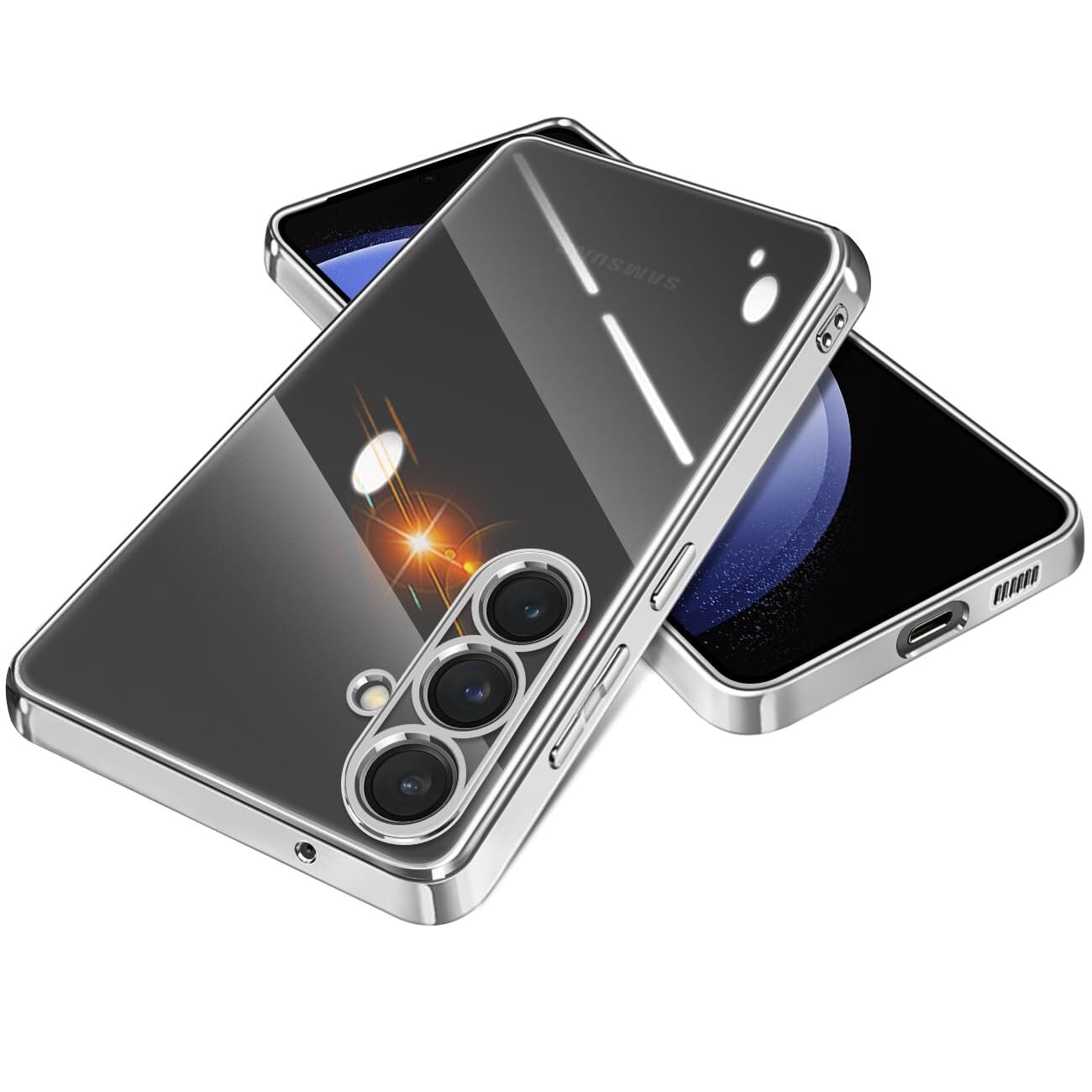 【FULEEYUHN】Samsung Galaxy S23FE ケース クリア ギャラクシー S23FE カバー 透明 TPU素材 耐衝撃 薄型 軽量 SCG24 対応 韓国 ファッション スマホケース メッキ加工 黄変防止 人気 ストラップホール付き ワイヤレス充電対応(シルバー)