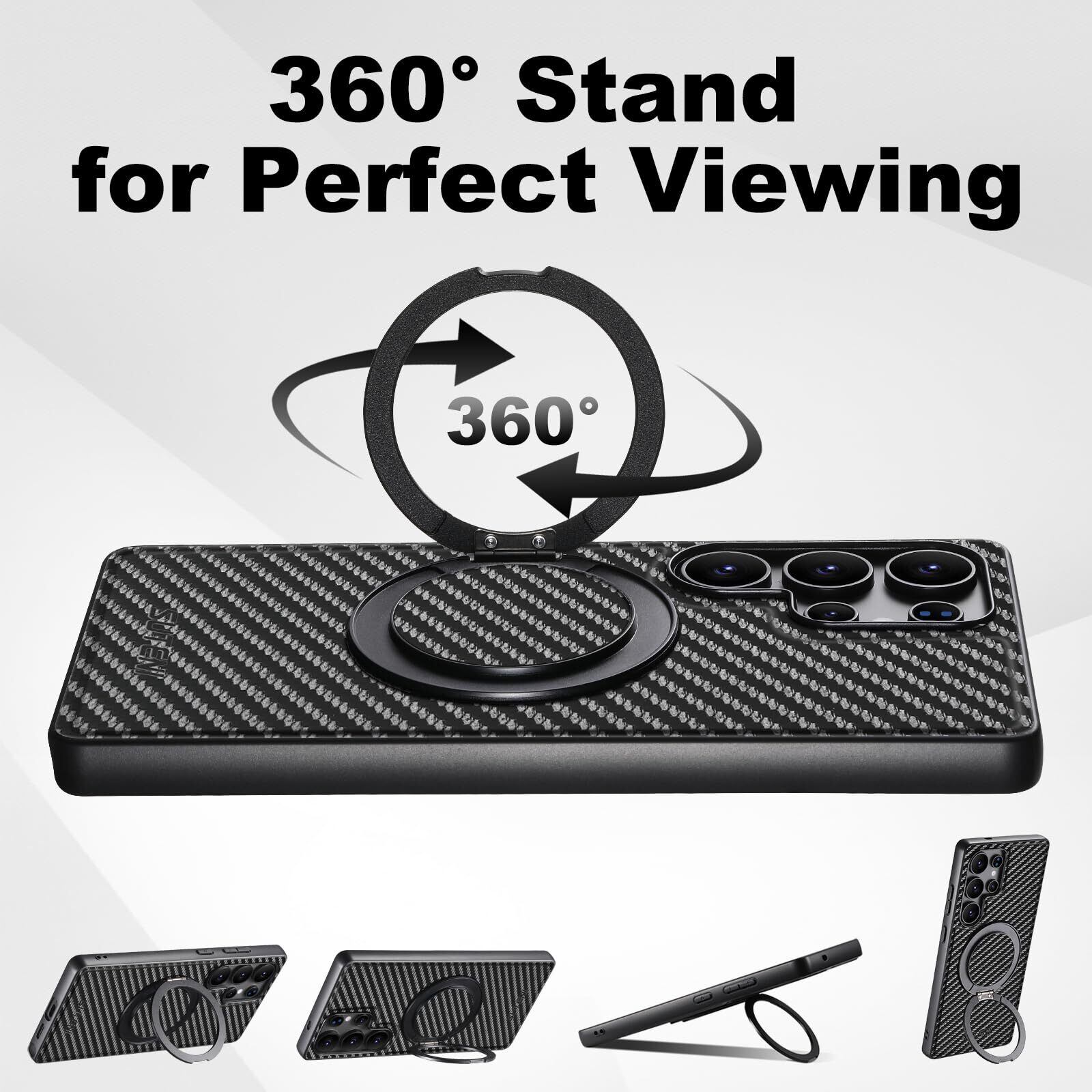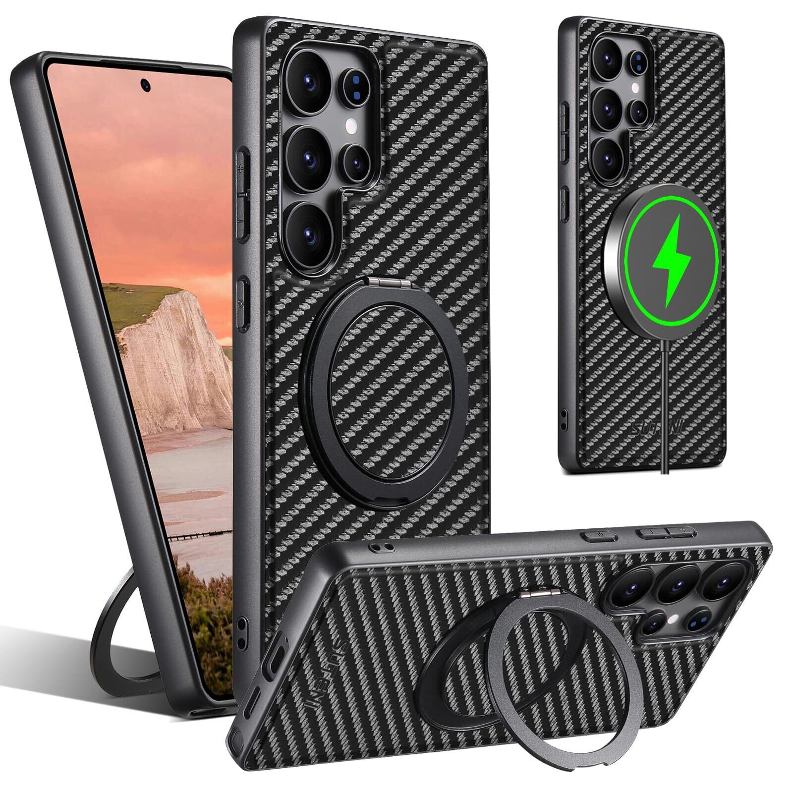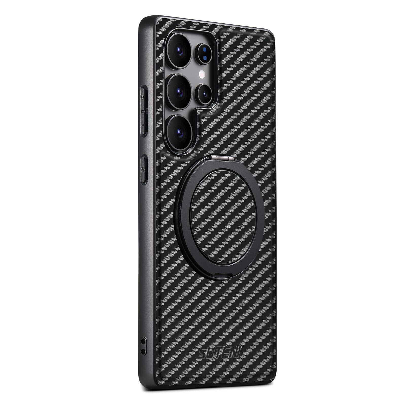 【努力特価】JCGOOD Samsung Galaxy S23 Ultra ケース360度回転スタンド隠し収納式多機能リング一体型横縦両立角度調整ギャラクシー S23 ウルトラ ケースMagSafe対応マグネット搭載サムスンS23 Ultra カバー滑り止め ワイヤレス充電ストラップ ホール付きレザー スマホケース軽量薄型耐衝撃Galaxy S23 Ultra 6.8 インチ用 ブラック炭素繊維