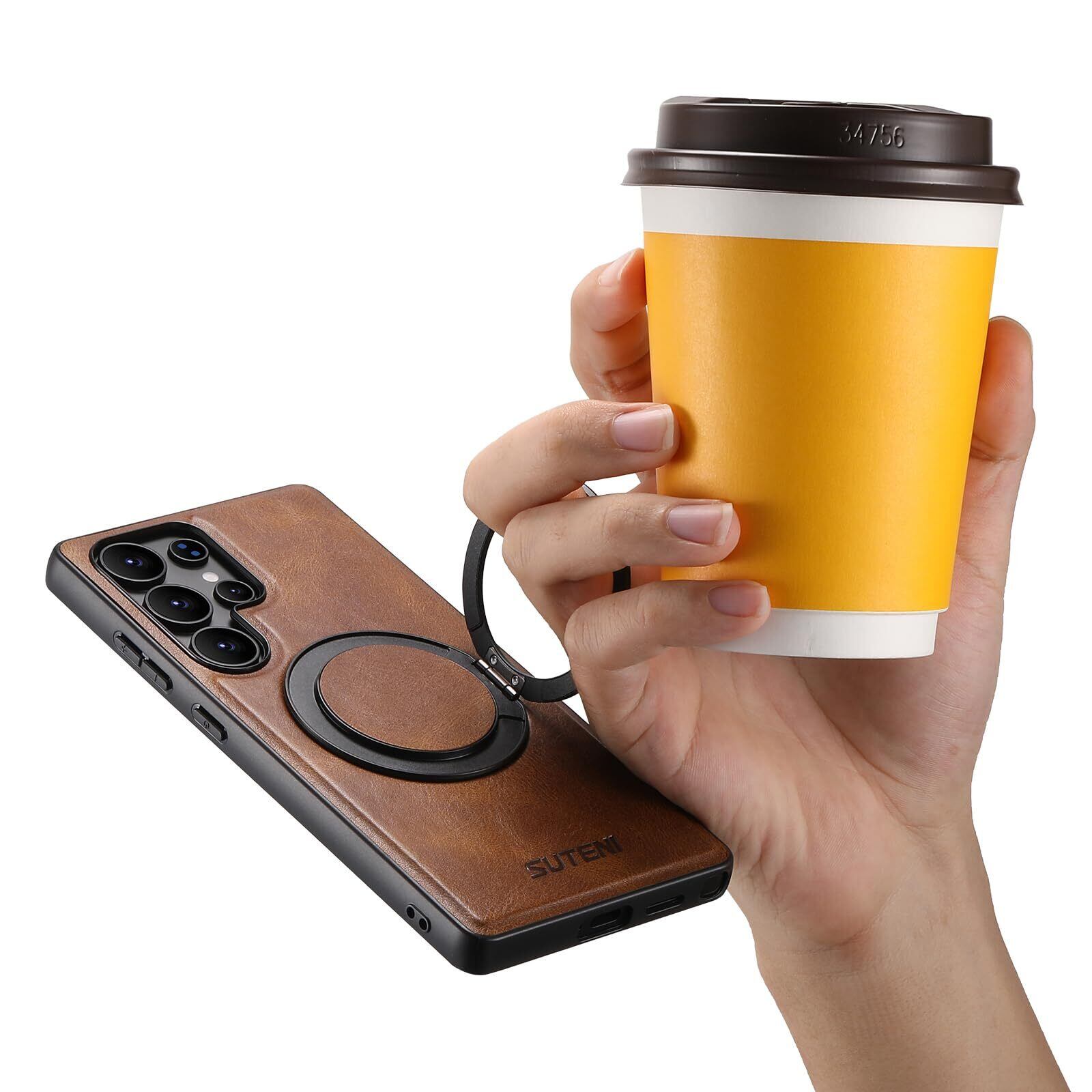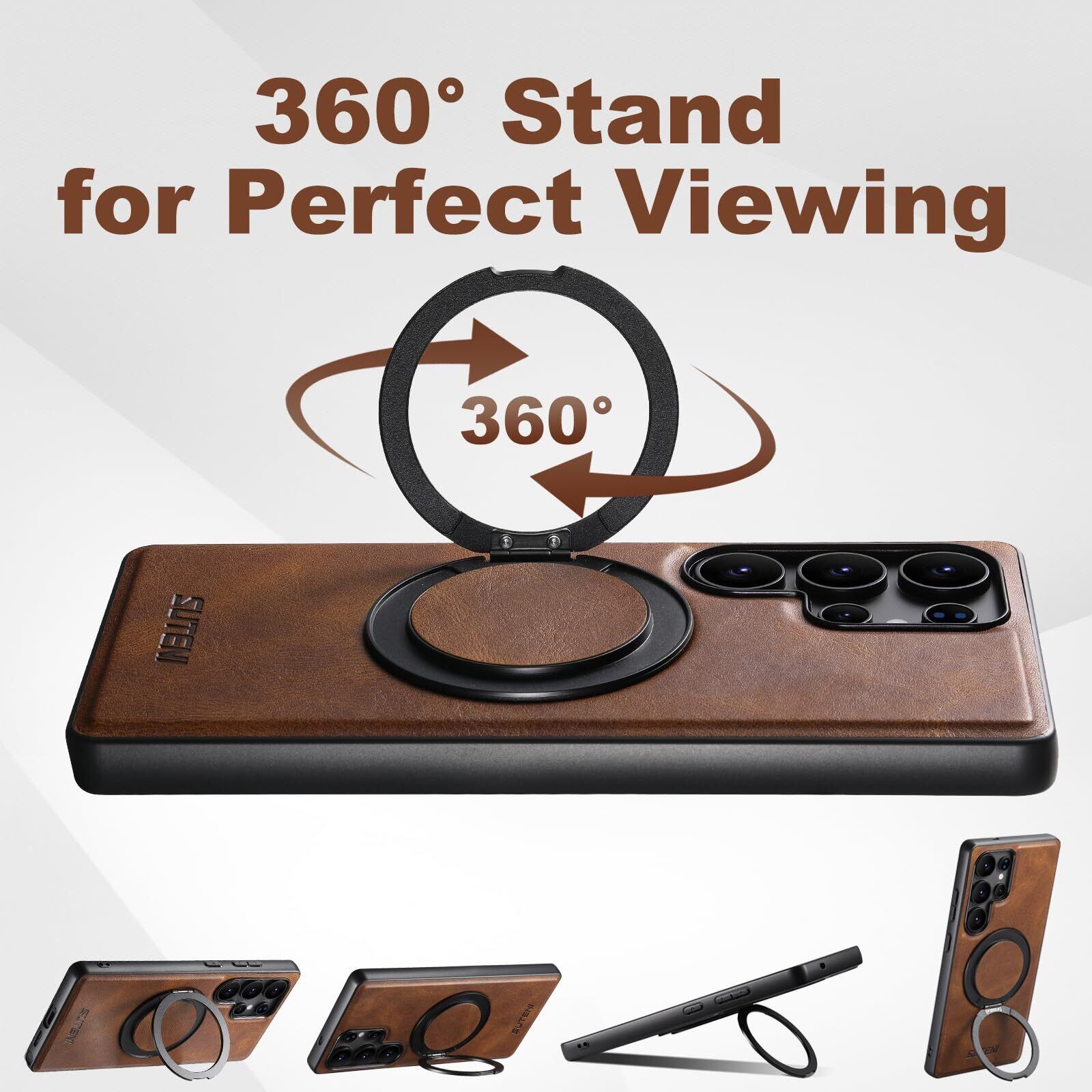 JCGOOD Samsung Galaxy S23 Ultra ケース360度回転スタンド隠し収納式多機能リング一体型横縦両立角度調整ギャラクシー S23 ウルトラ ケースMagSafe対応マグネット搭載サムスンS23 Ultra カバー滑り止め ワイヤレス充電ストラップ ホール付きレザー スマホケース軽量薄型耐衝撃Galaxy S23 Ultra 6.8 インチ用 ブラウン