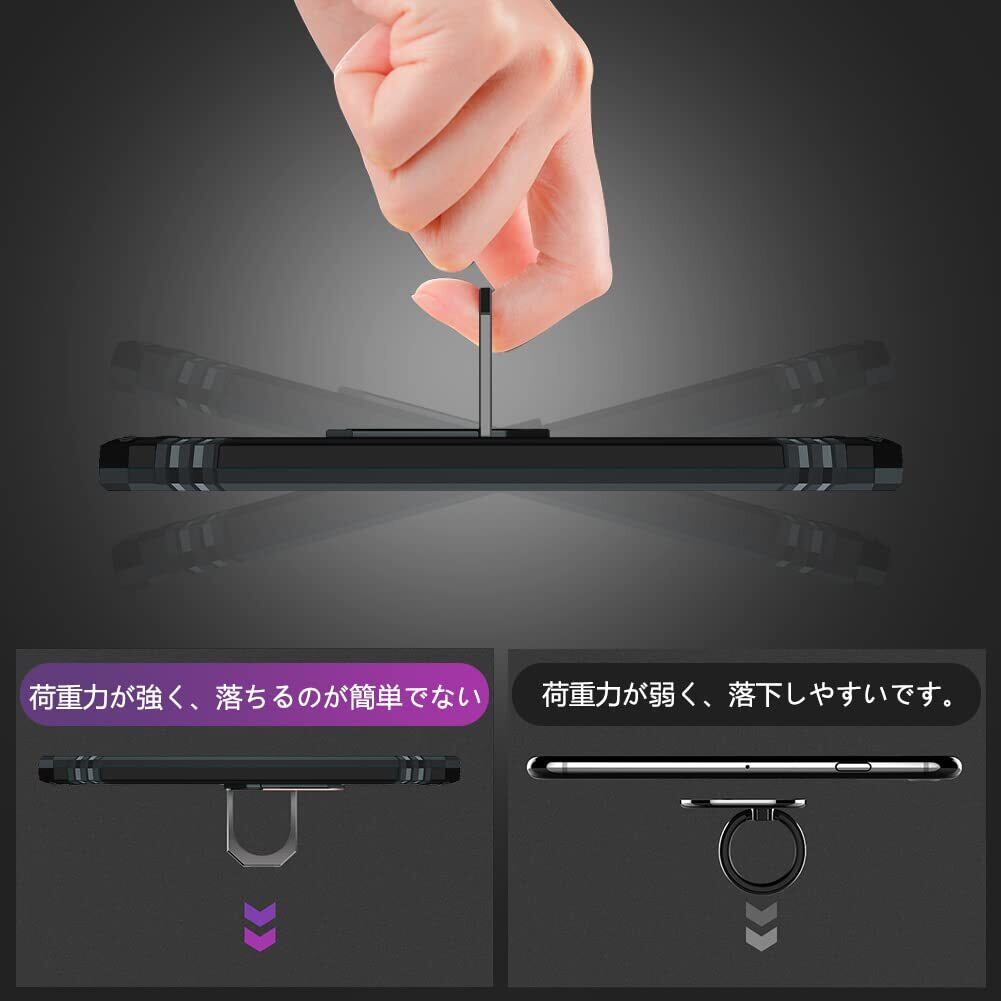 [リング付き、車載スタンド対応] 後ろに付いているフィンガーリングはスタンド機能はもちろん、滑りにくくて持ちやすい、安定的なグリップが特徴です。横置きどんな角度でも固定できます。マグネット式車載ホルダーに対応し、内蔵メタルシートのデザインで、車の磁石支持して使用できます。360度回転可能、180角度調節可能。