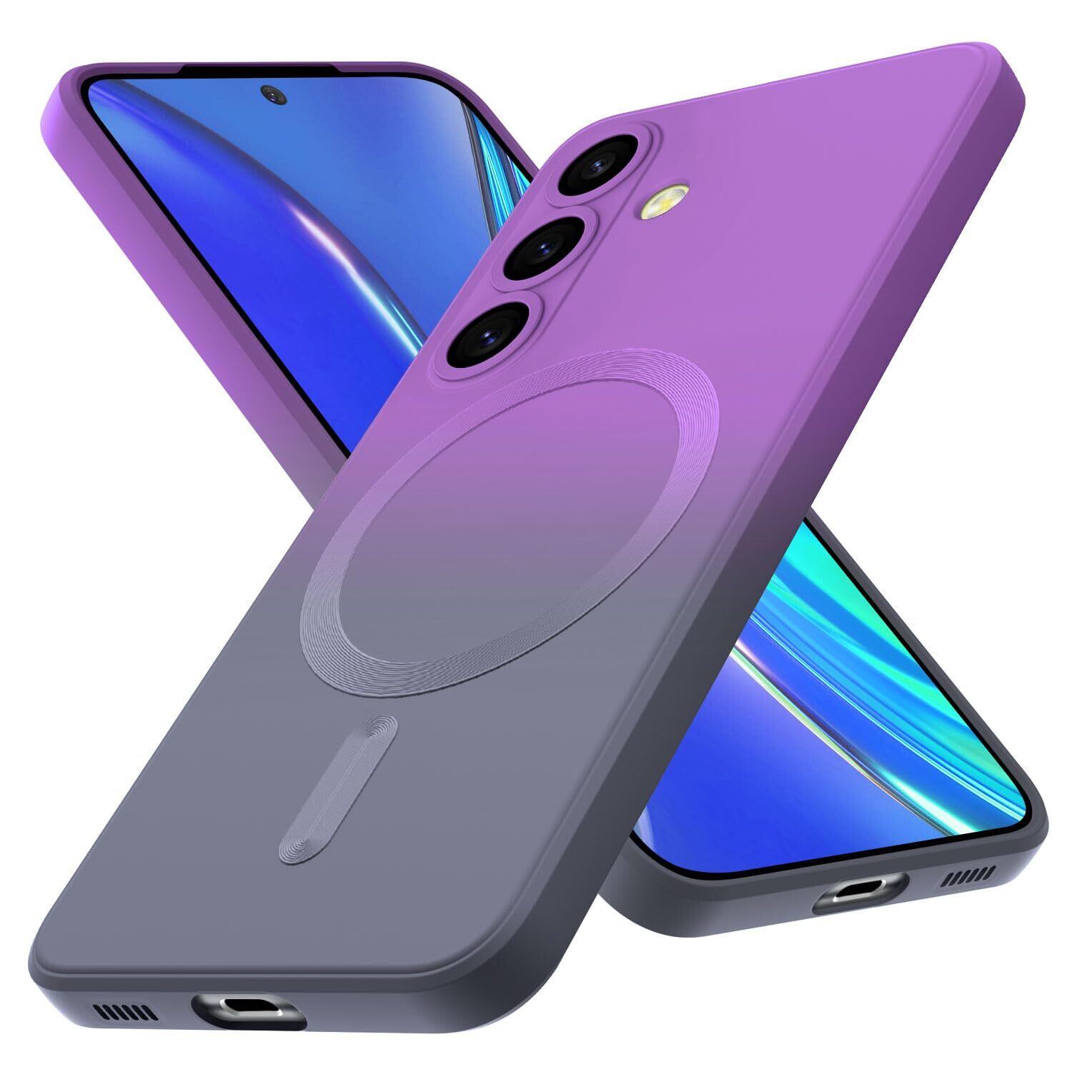 Galaxy S25 用 ケース TPU 薄型 軽量 ケース 耐衝撃 マグネット搭載 ストラップホール付き スマホケース シリコン 背面ワイヤレス充電 黄変防止 すり傷防止 マグセーフ対応 人気 ギャラクシー s25 用カバー パープル/グレー AYS-25-82