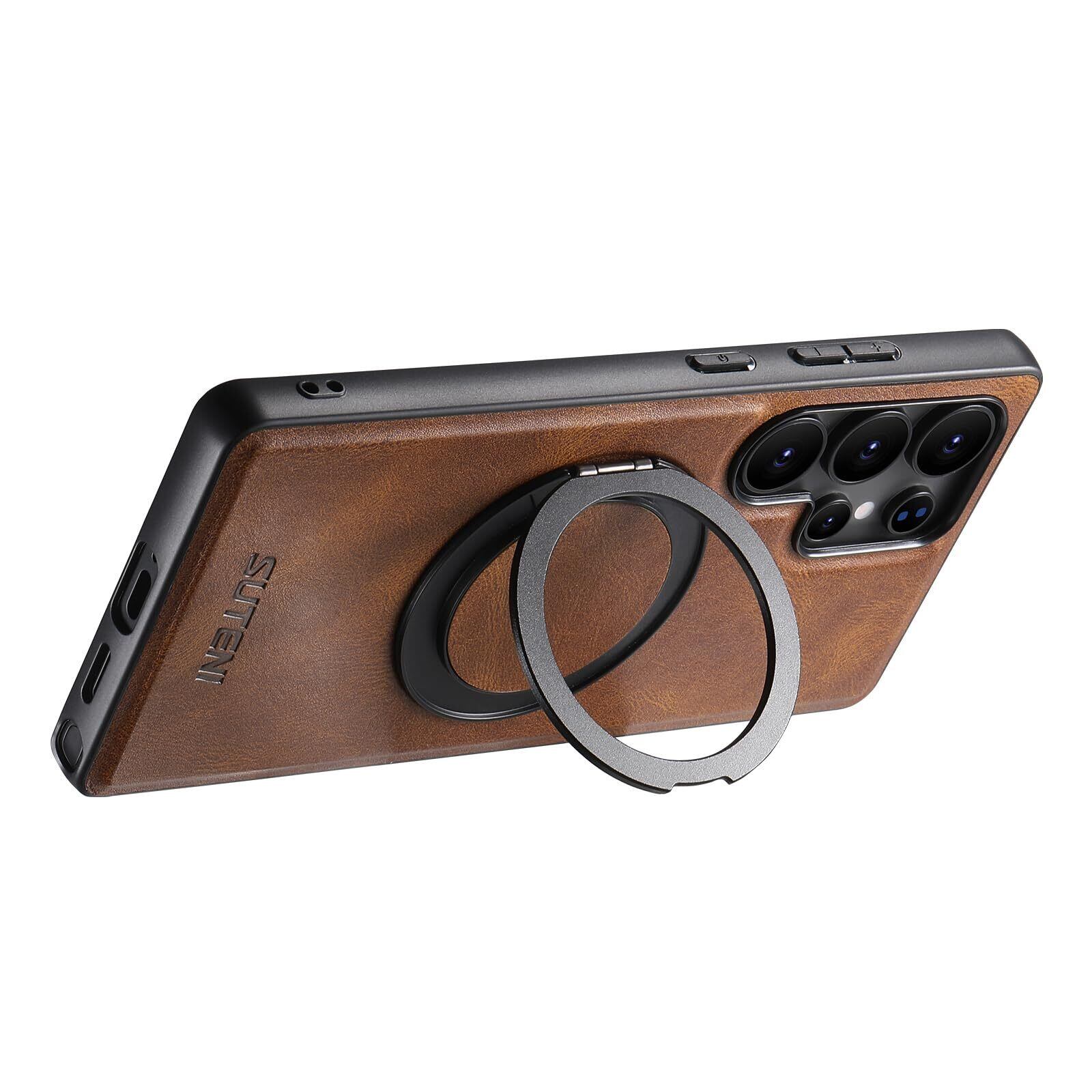 JCGOOD Samsung Galaxy S24 Ultra ケース360度回転スタンド隠し収納式多機能リング一体型横縦両立角度調整ギャラクシー S24 ウルトラ ケースMagSafe対応マグネット搭載サムスンS24 Ultra カバー滑り止め ワイヤレス充電ストラップ ホール付きレザー スマホケース軽量薄型耐衝撃Galaxy S24 Ultra 6.8 インチ用 ブラウン