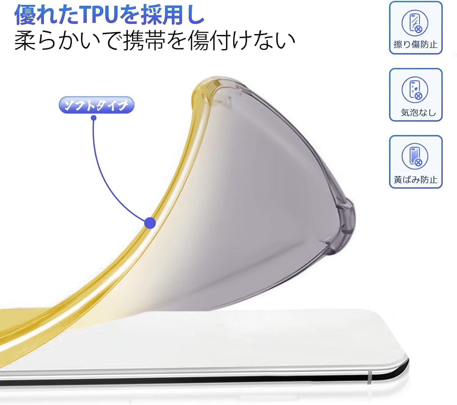 【高靭強化TPU 】:保護ケース全体は高品質の高靭強化TPU素材でできています。これは 本体のワイヤレス充電を完全にサポートします。本体の熱も効率的に放出されます。他に、特殊加工を施すことでより高い透明度と指紋防止、黄変防止を実現しました。