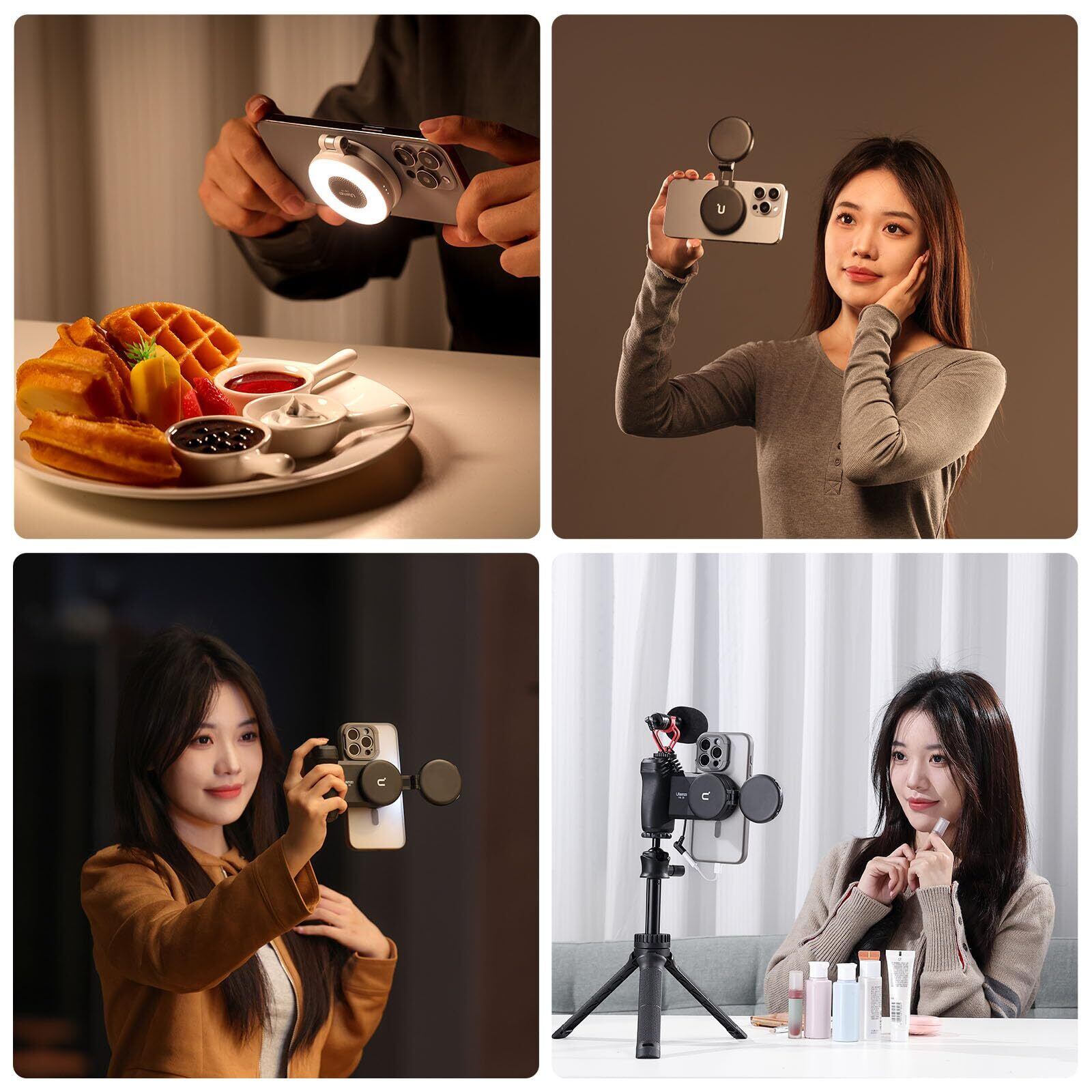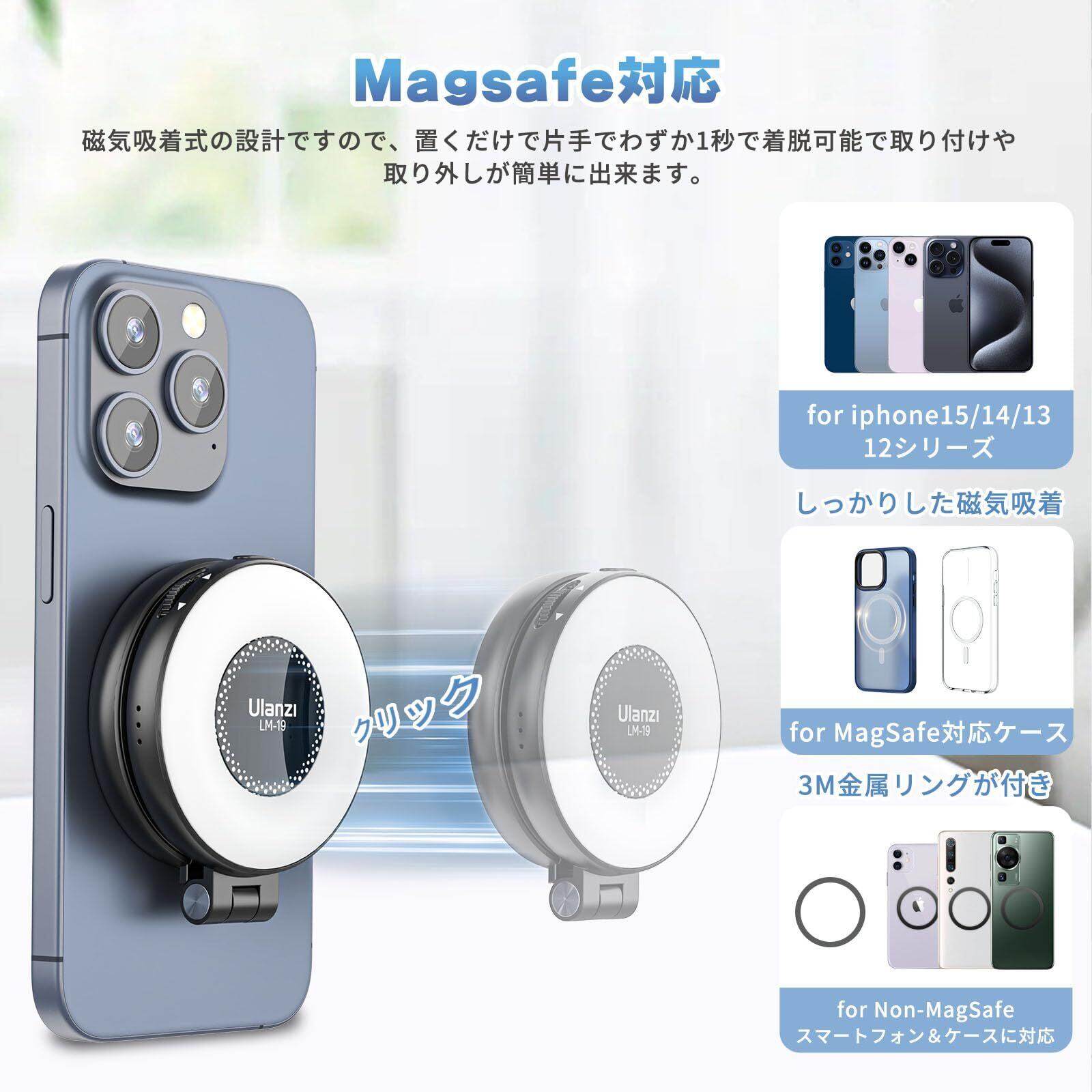 【MagSafe用 撮影用ライト】Ulanzi LM19 リングライトは2024最新のマグネット設計を採用し、置くだけで片手でわずか1秒で着脱可能で取り付けや取り外しが簡単に出来ます。iPhone 17/16/15/14/13シリーズ以降のスマホやMagSafeケースに対応できます。MagSafe非対応ケースとスマホを使用する場合、ケースの外側に金属製のリングを貼り付けることも可能であります。