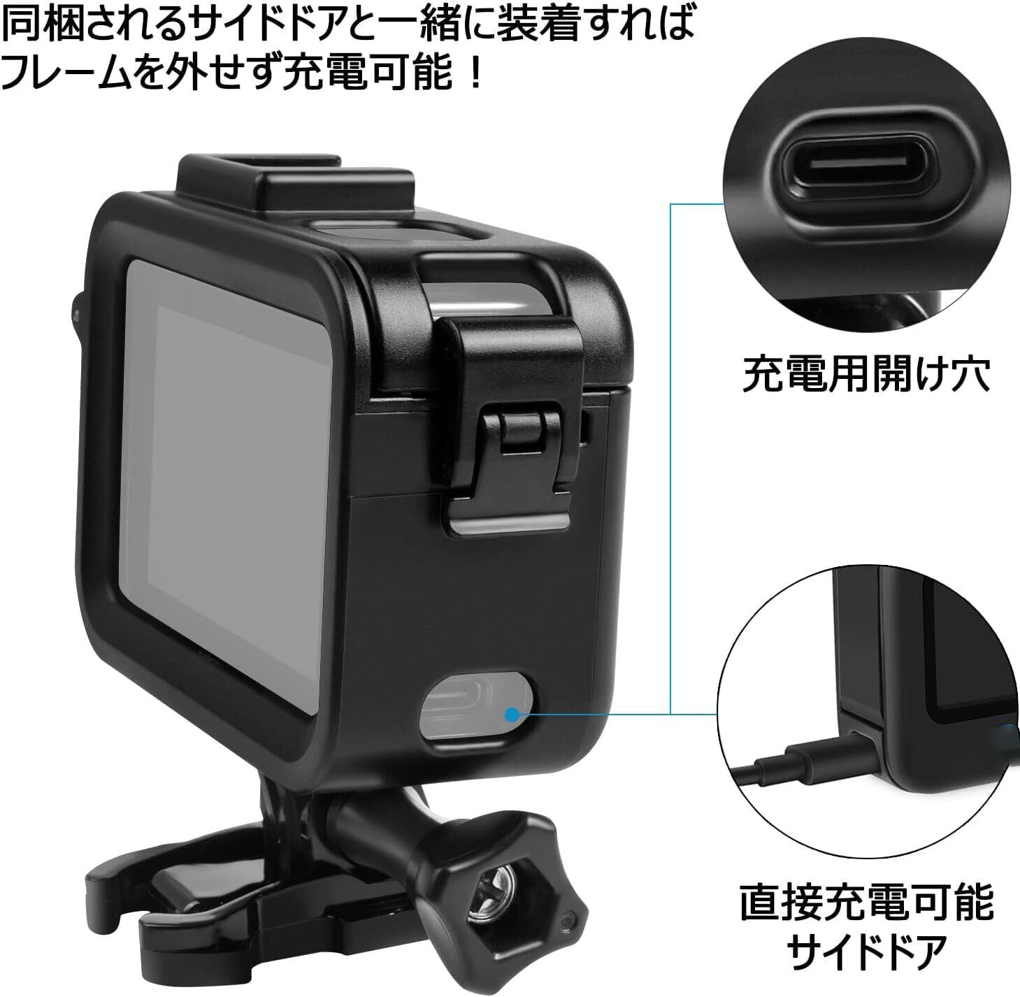 【Taisioner】GoPro HERO12/11/10/9専用 保護フレーム+シリコンキャップ+充電開口サイドドア 上部開閉型 第2世代 充電可能 マイク・ディスプレイ・ライト用装着位置付き(一つ) Taisionerのストアを表示