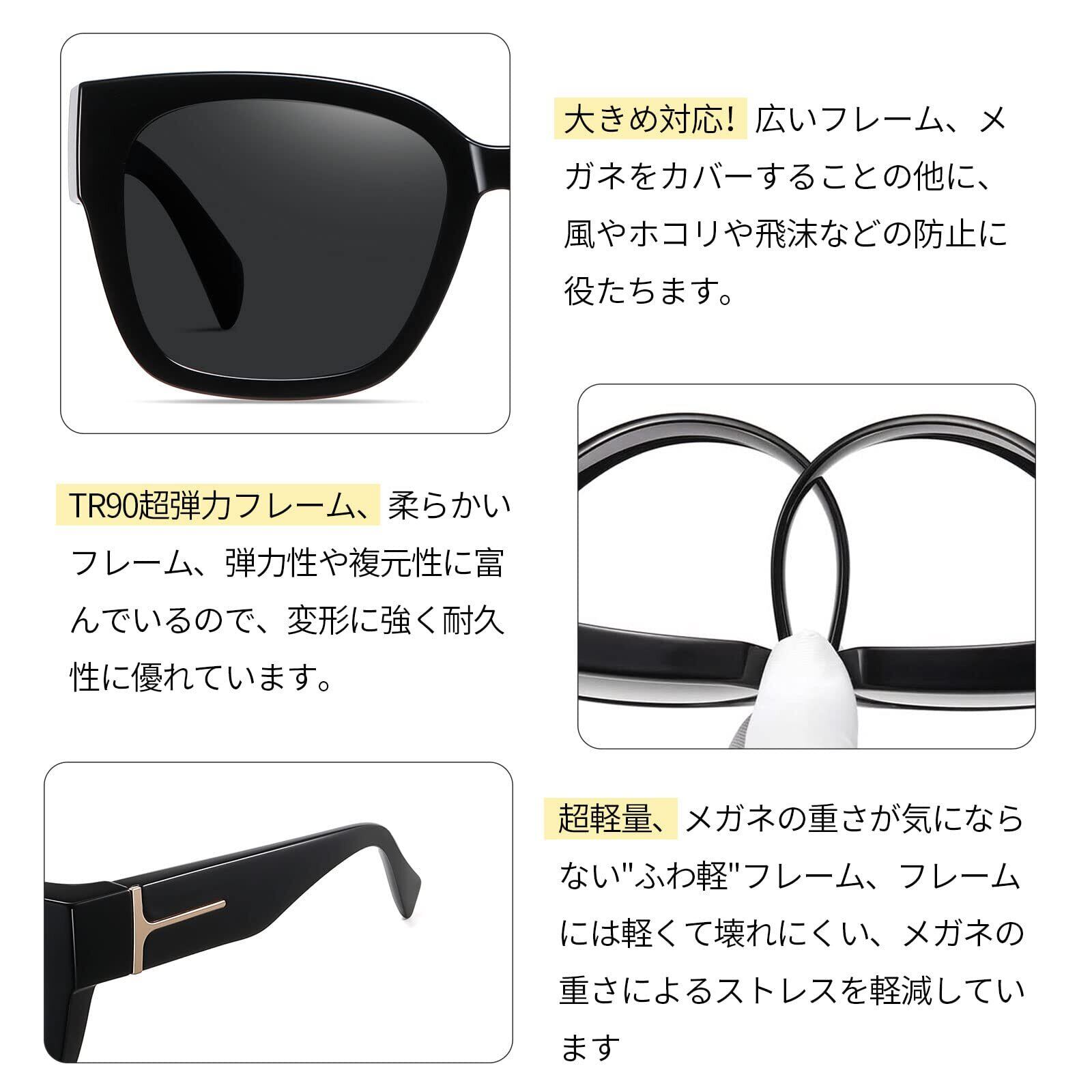 高弾性TR90素材:超軽量高弾性素材TR-90 を採用し、柔らかくて耐摩耗性に優れて弾力性もよいです。落下することにご心配いりません。アウトドア好き、運転手さんにこのオーバーサングラスをお勧めします