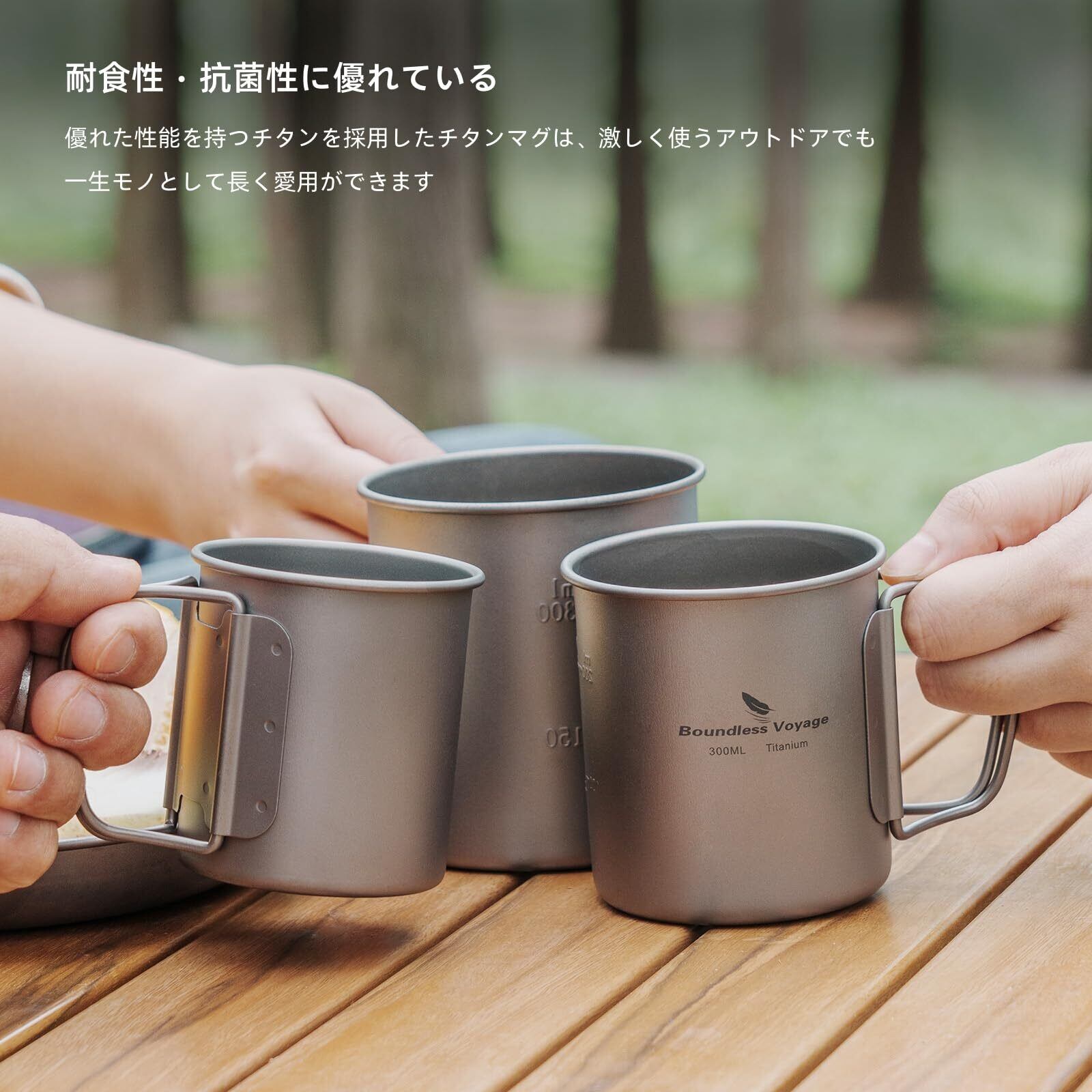 【チタン製マグカップ】 チタン製マグカップは、強度が高く、軽量で、耐食性に優れた素材です。錆びにくく、耐久性があります。また、イオン化せず金属臭がほとんど感じられないため、飲み物をより美味しく楽しむことができます。