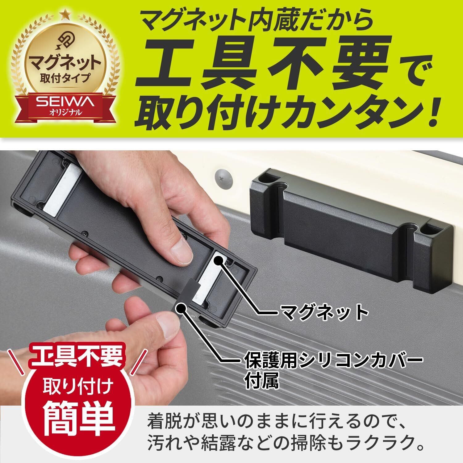●強力マグネット内蔵なので工具不要で簡単に取り付けられます。