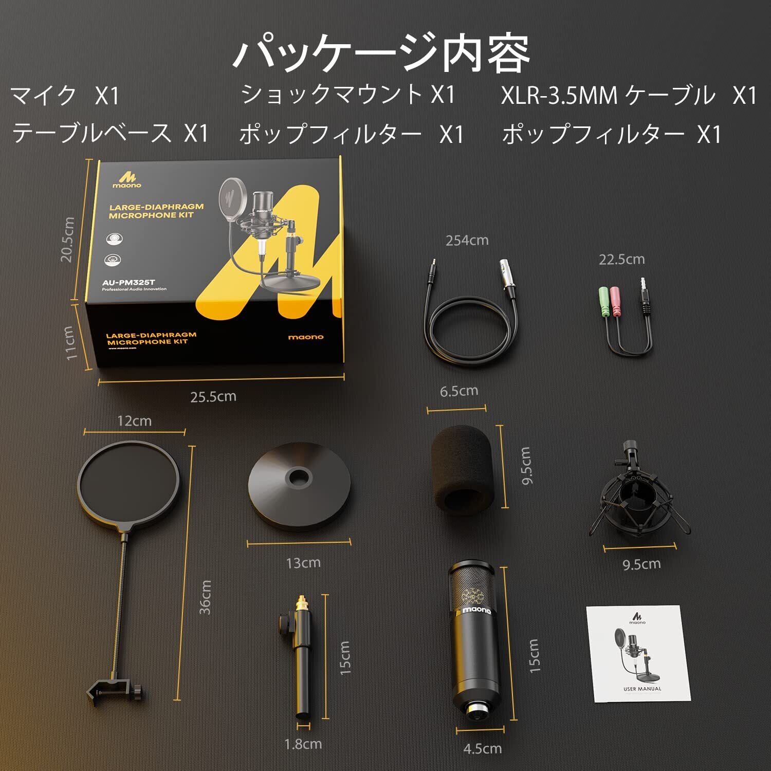 MAONO XLR-3.5mmマイク コンデンサーマイク マイクセット 単一指向性 配信用マイク アームスタンド/25mmラージカプセル 音響システム/アンプ/ミキサー向け 音楽製作/録音/生放送/YOUTUBE/ポッドキャストに適応(AU-PM325T)
