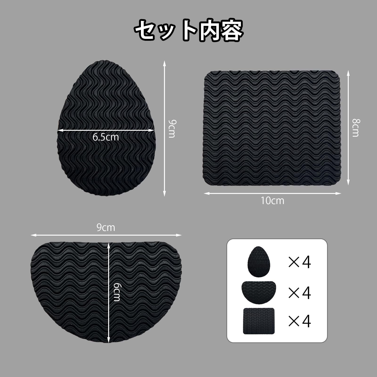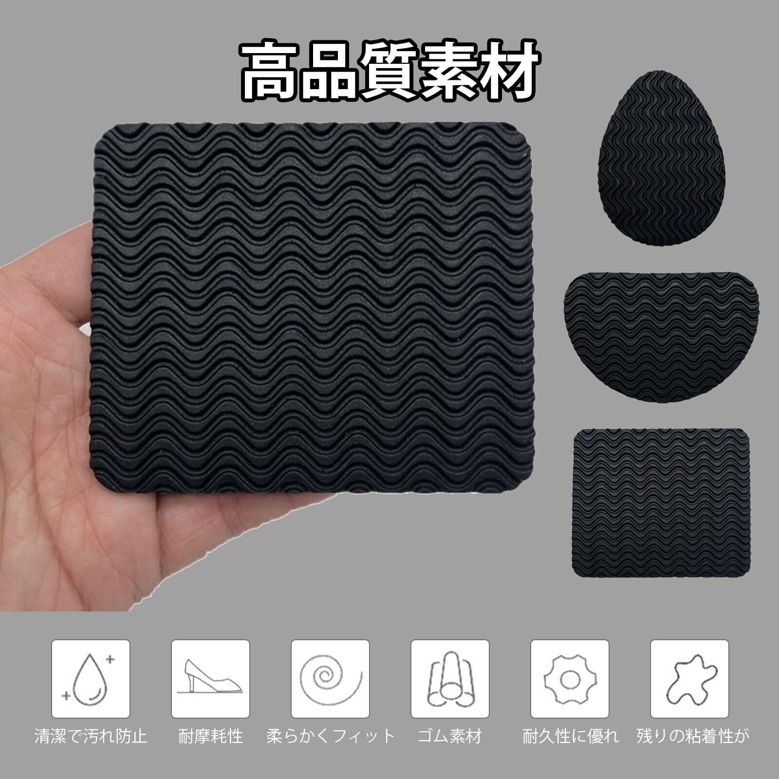 【商品仕様】靴底滑り止めパッド6ペア12枚セット。素材:ゴム。色:ブラック。つま先+かかと各4枚、スクエアインソール4枚、靴底の形状に合わせて自由にカットすることができます。