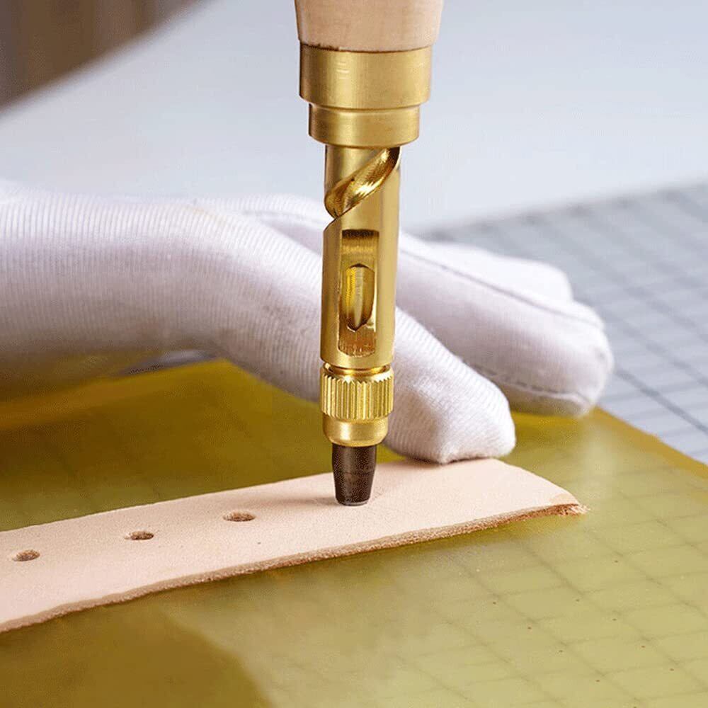 ??操作が簡単です。 指示通りに穿孔チップをはめ込み、穿孔機のハンドルをしっかりと手に持ち、革に対して垂直に当ててしっかりと押さえ、円を描くように軽く回転させるだけで、簡単に欲しい穴が開けられます。