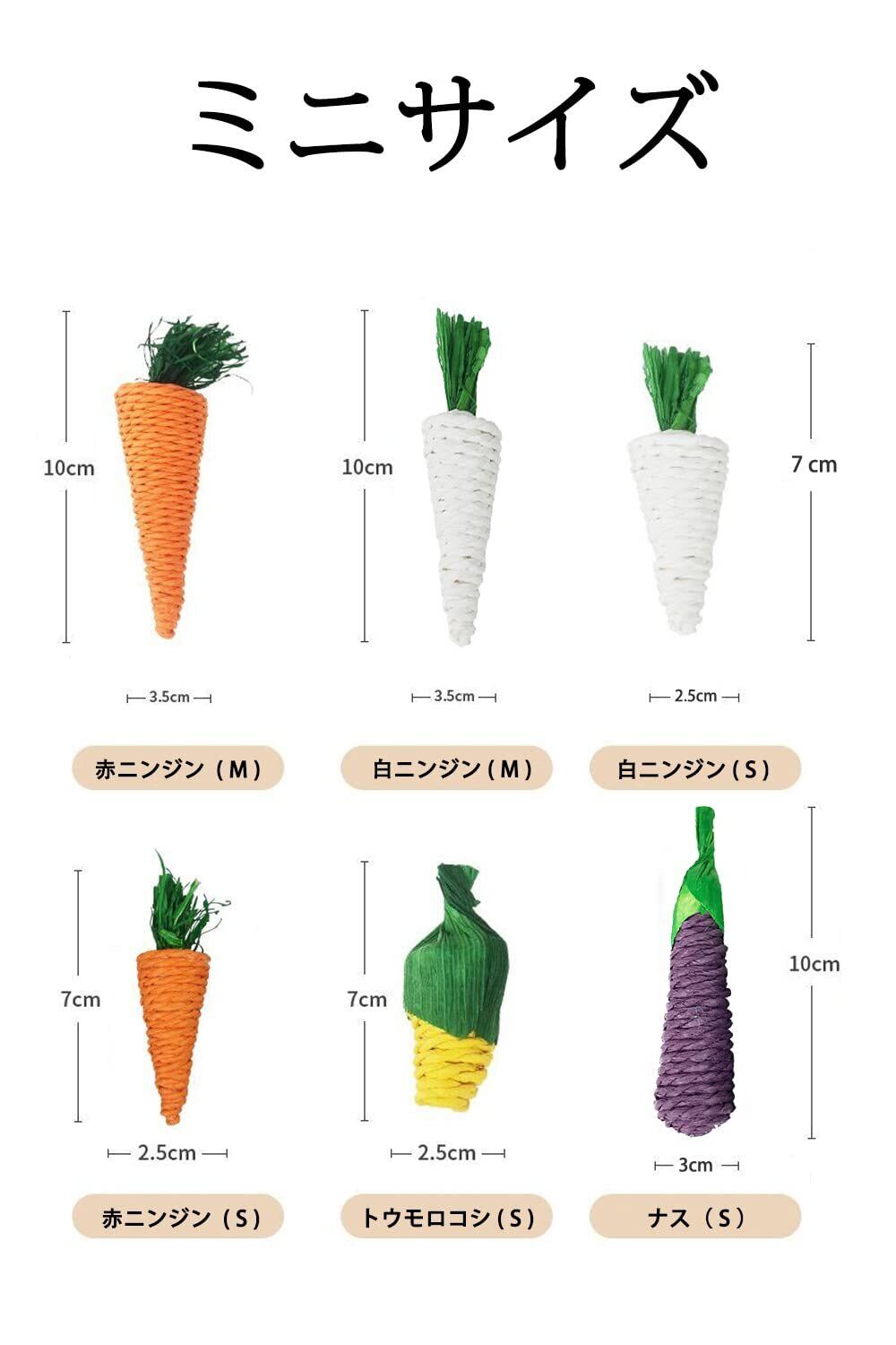 【商品詳細】小動物咀嚼玩具セットには、合計6つの天然干し草編みおもちゃ。にんじん型のおもちゃ4個、とうもろこし型のおもちゃ1個、なす型のおもちゃ1個。