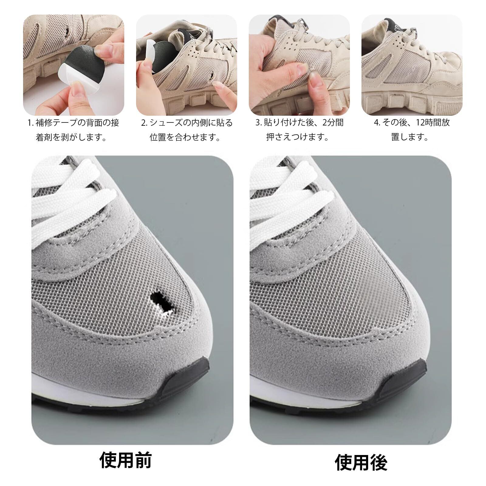 【強粘着性】裏面の紙を剥がして直接傷ついた箇所に貼り付け、しっかり押さえるだけで、滑り落ちる心配はありません。この修理パッチは防水で、靴のかかと部分に貼ると、簡単に剥がれません。