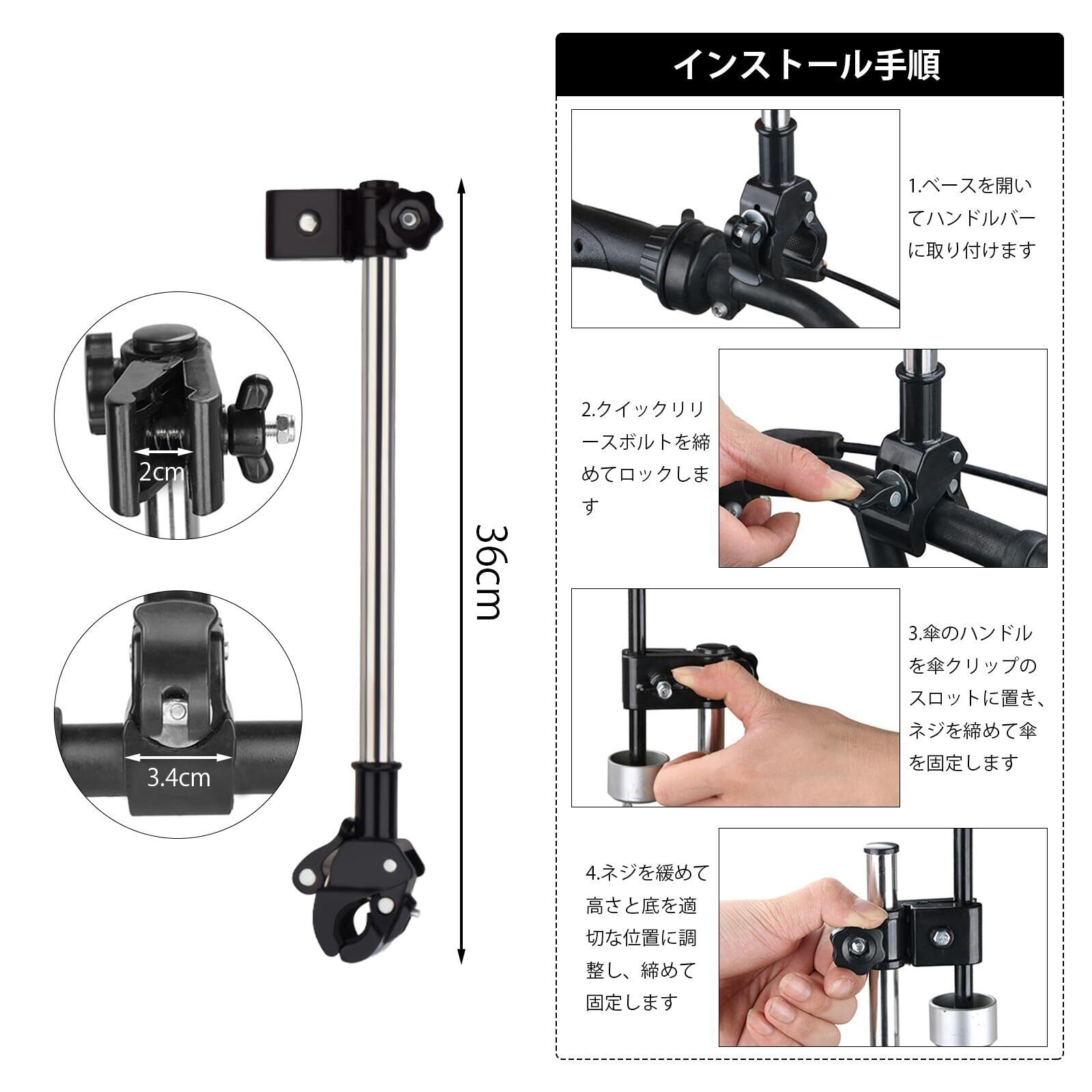 自転車に乗る際の安全性を高めるこの便利な傘ホルダーは、手元にしっかりと固定され、雨の日でも快適に走行できます。360度回転するので、風向きに合わせて調整が可能です。丈夫な素材で作られており、長期間の使用に耐えられます。雨に濡れた道路を安心して走れるよう、この傘ホルダーで自転車の安全性をアップさせましょう。