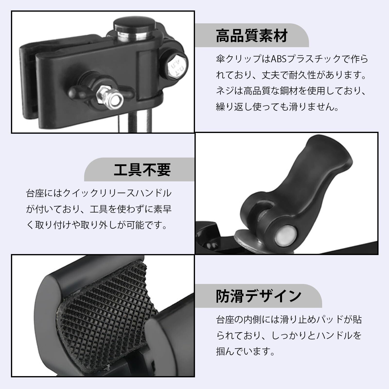【商品説明】自転車に傘を固定するための傘立てです。どこに置いてもすぐに取り付けられ、時間と労力を節約します。