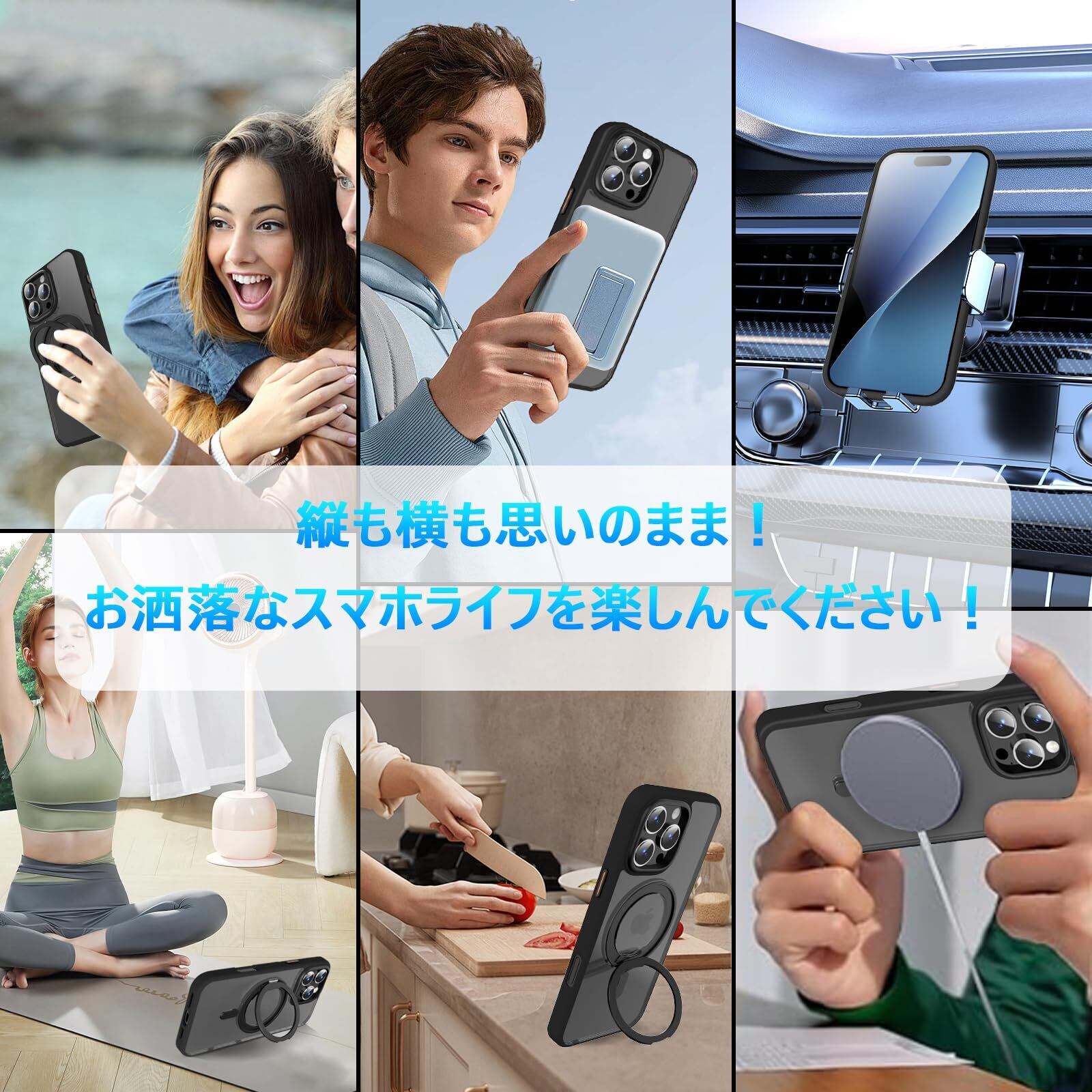 互換品 スマホケース【iPhone 16Pro 用 MagSafe対応 ケース】360°回転スタンド ワイヤレス充電対応 iphone 16 pro 用 ケース リング付き 米軍MIL規格 いphone16pro 用 ケース 超強磁力 落下防止iphone16pro 用 ケース 耐衝撃 アイフォン16pro 用 ケース 半透明 防指紋(ブラック)