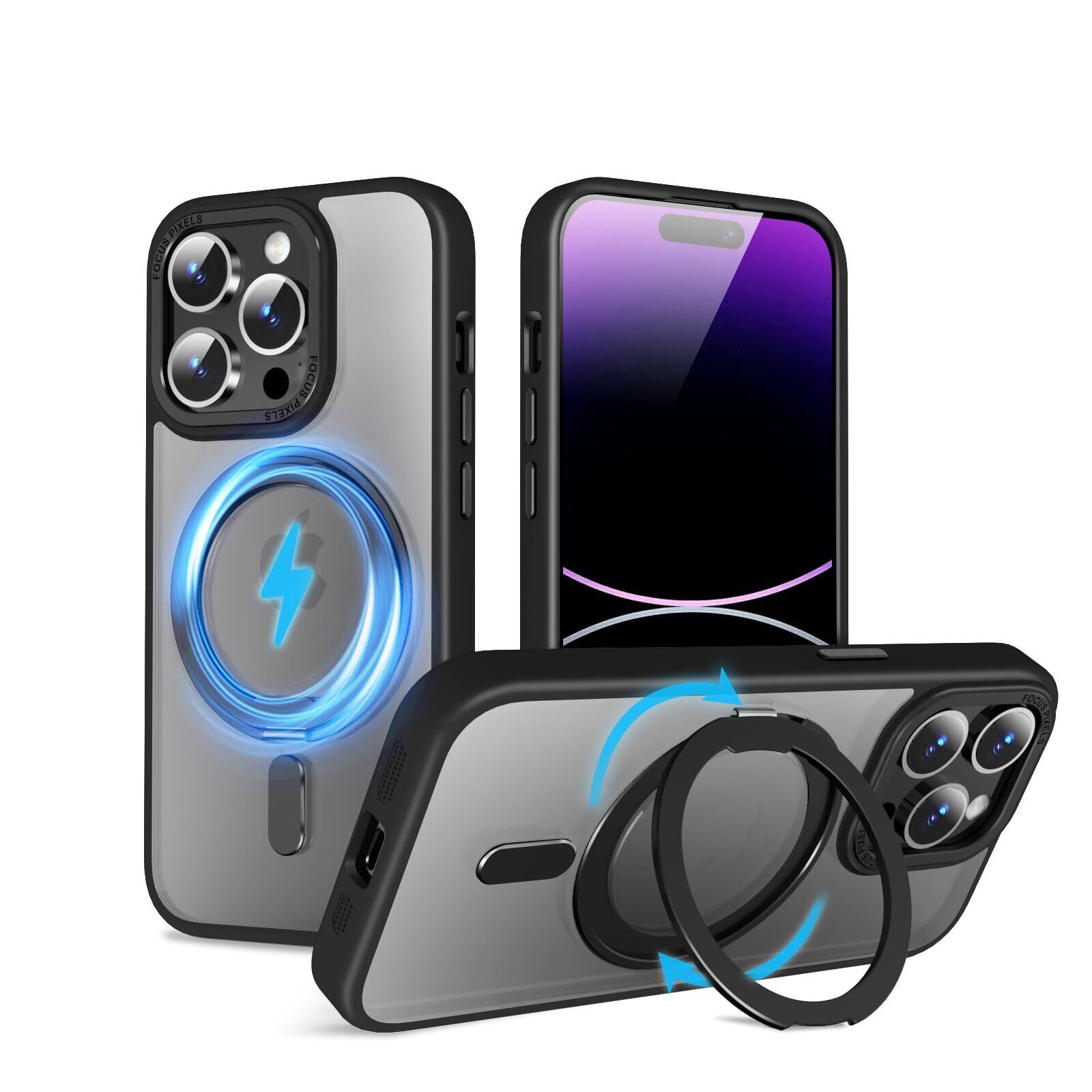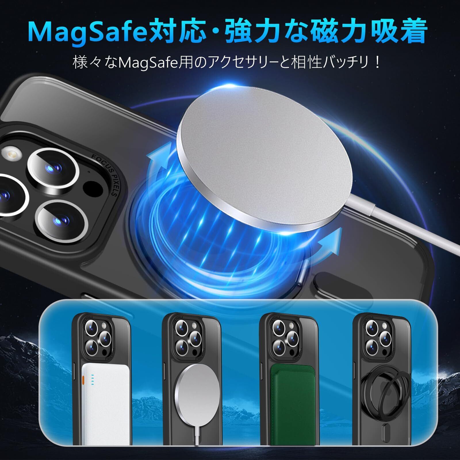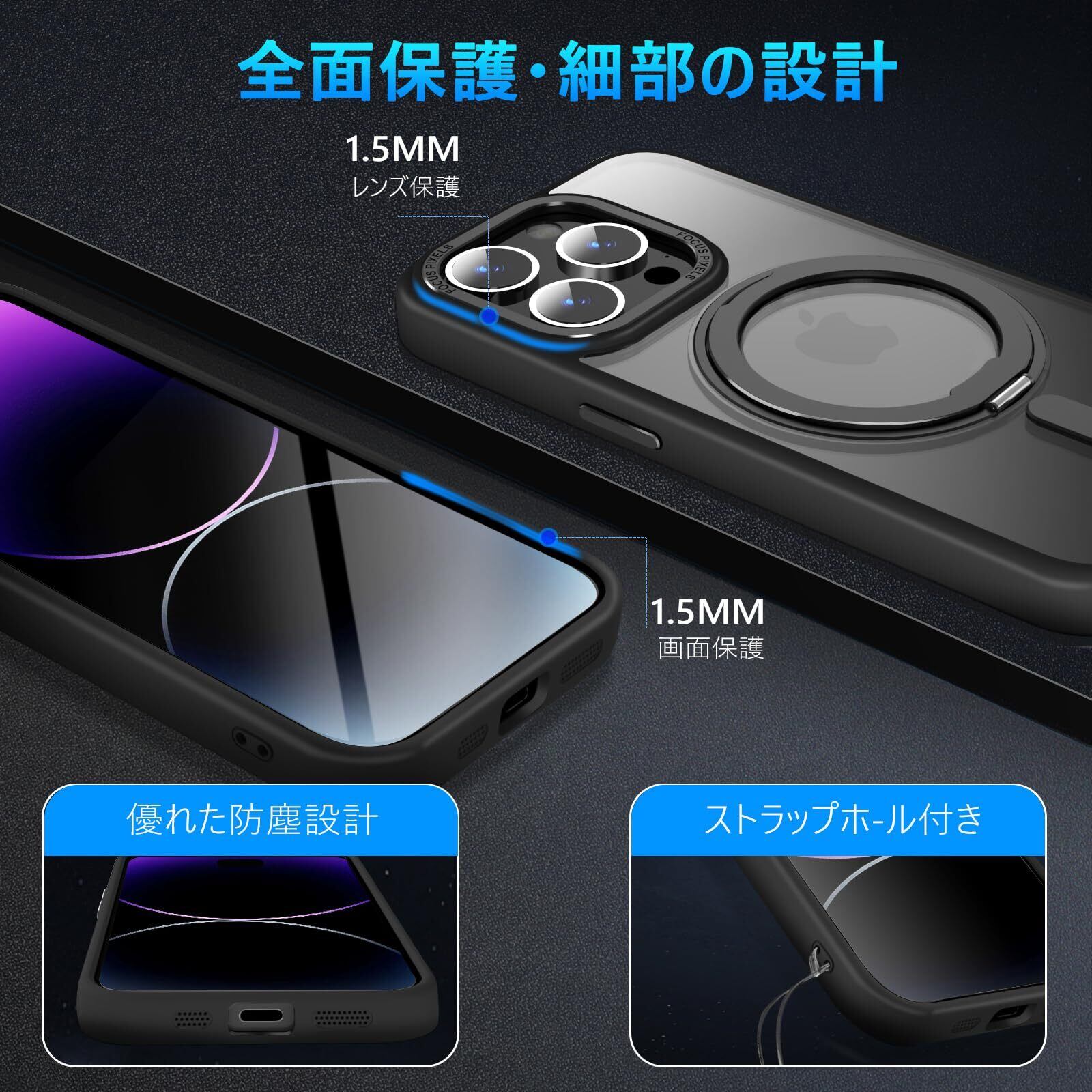 【iPhone 14Pro 用 MagSafe対応 ケース】360°回転スタンド ワイヤレス充電対応 いphone14pro ケース リング付き 米軍MIL規格 アイフォン14pro カバー magsafe 超強磁力 落下防止 iphone14プロ カバー 耐衝撃 半透明 防指紋(ブラック)