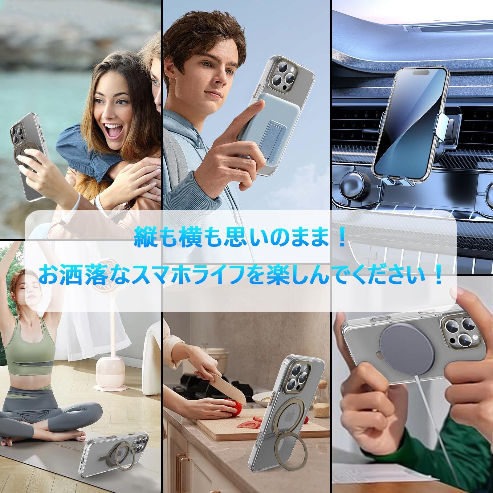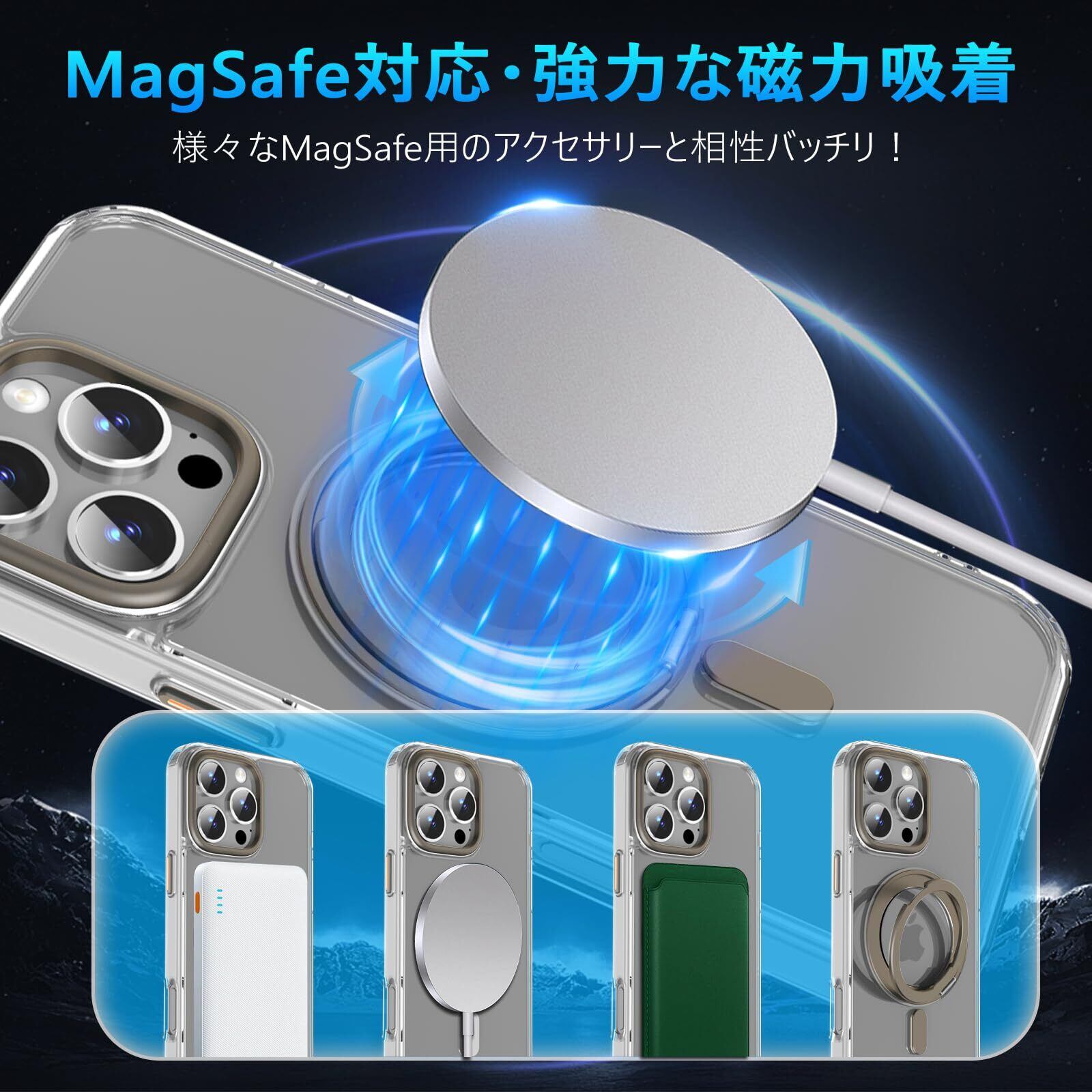 【MagSafe対応・強力な磁力吸着】背面に薄くて強いマグネット内蔵しています、吸着力を高めて、安定感をアップしてエネ損失なしの快速ワイヤレス充電できる。ケースをつけたままマグセーフ機能を快適に使用できます。車載ホルダーでの使用時もとても安心感溢れ、様々なMagSafe用のアクセサリーと相性バッチリ!より安全、安定、急速なワイヤレス充電体験をもたらします。ご注意:この製品はすべての Magsafe デバイスと互換性がありますが、Qi フイャレス充電には適していないため、購入する前にこの点を考慮してください