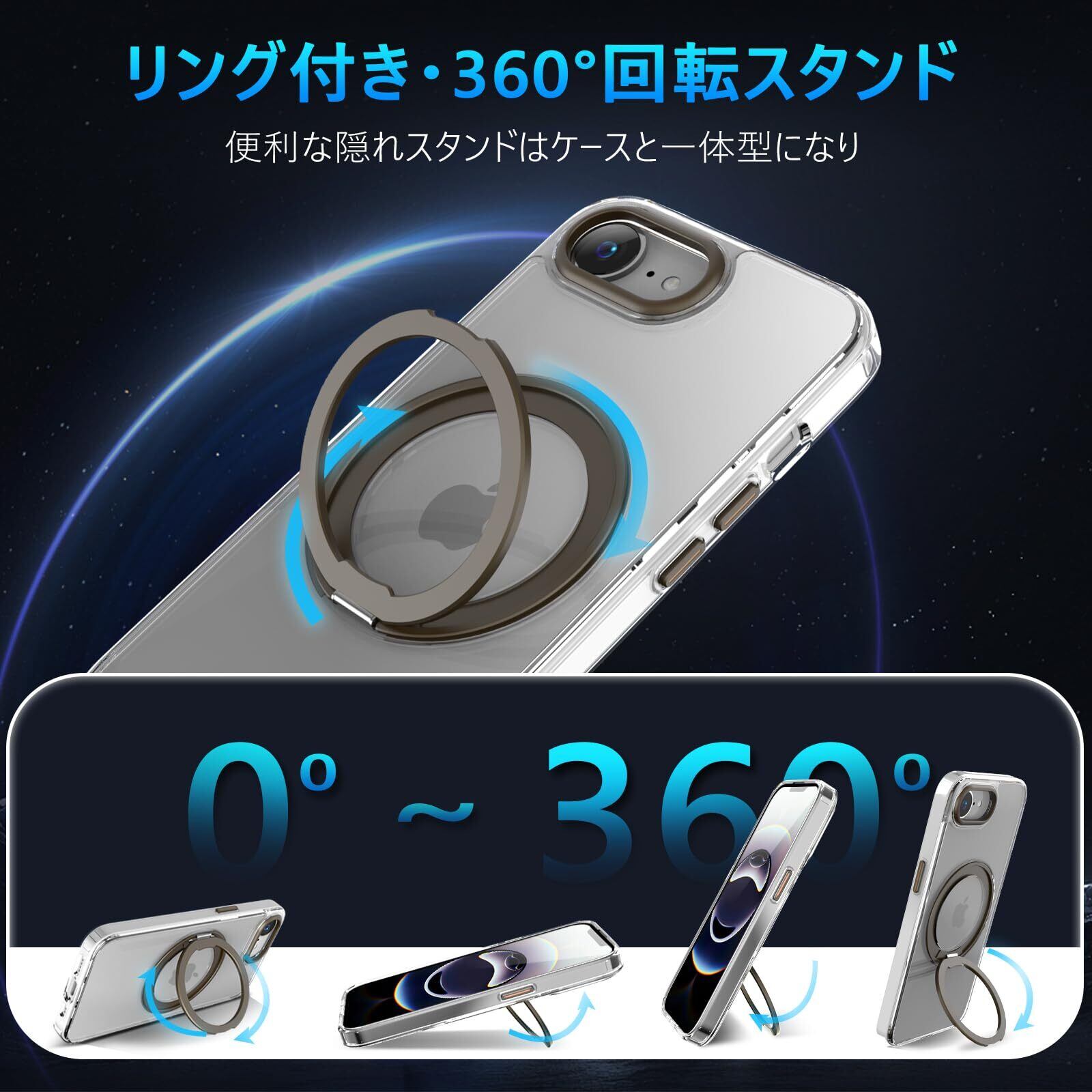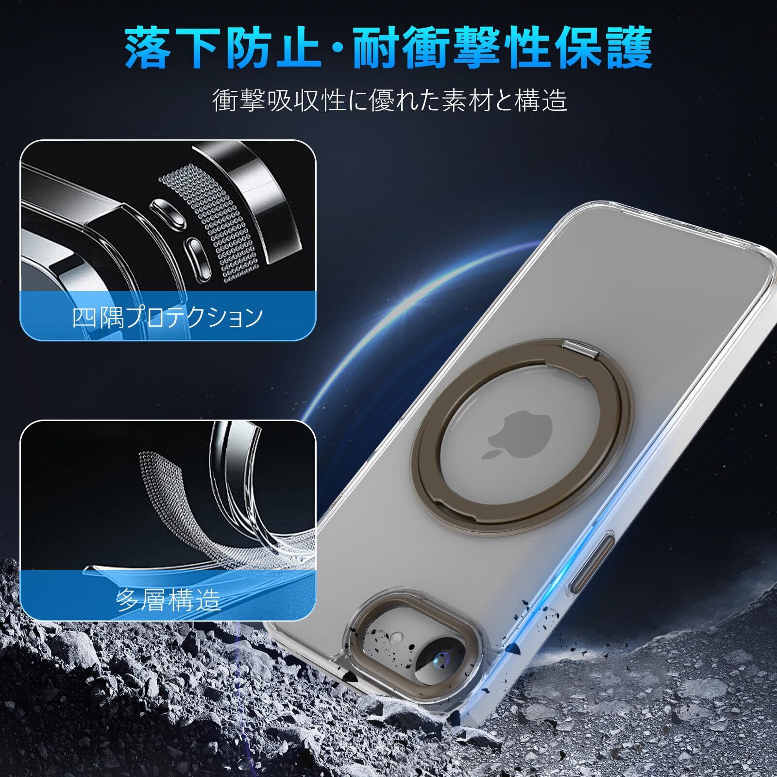 【iPhone 16e MagSafe対応 ケース】360°回転スタンド ワイヤレス充電対応 あいふおん16e ケース リング付き 米軍MIL規格 アイフォン16e カバー magsafe 超強磁力 落下防止 耐衝撃 半透明 防指紋(透明+デザートチタニウム)