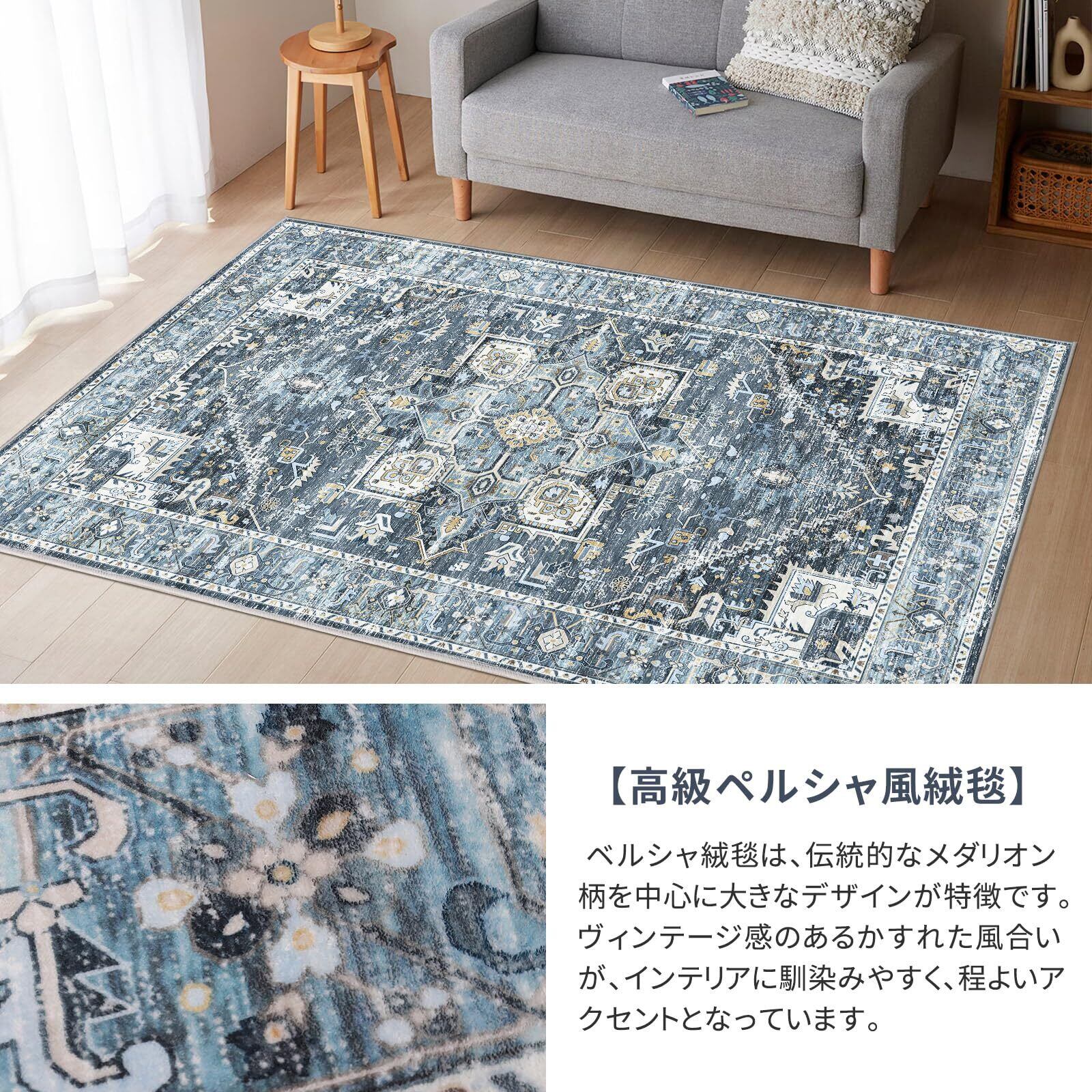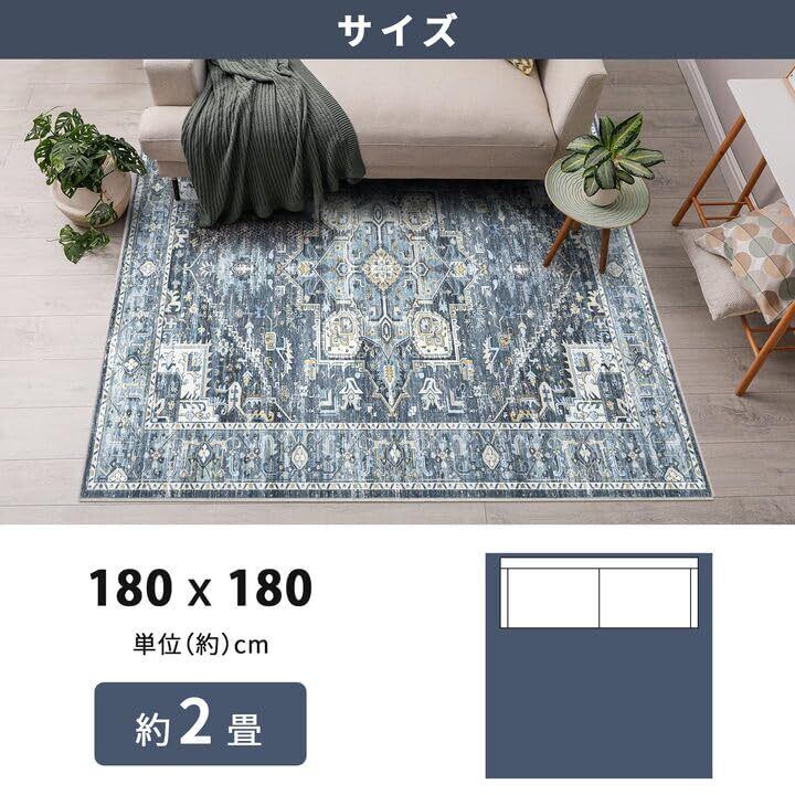 ラグ カーペット マット ペルシャ風絨毯 大判 185×185cm(2畳相当)|洗える 滑り止め 低反発 防音 床暖房対応| 抗菌防臭 防ダニ|北欧 幾何学 デザイン エスニック風 インテリア 北欧 チェアマット |リビング・オフィス オールシーズン 高級 ブルー