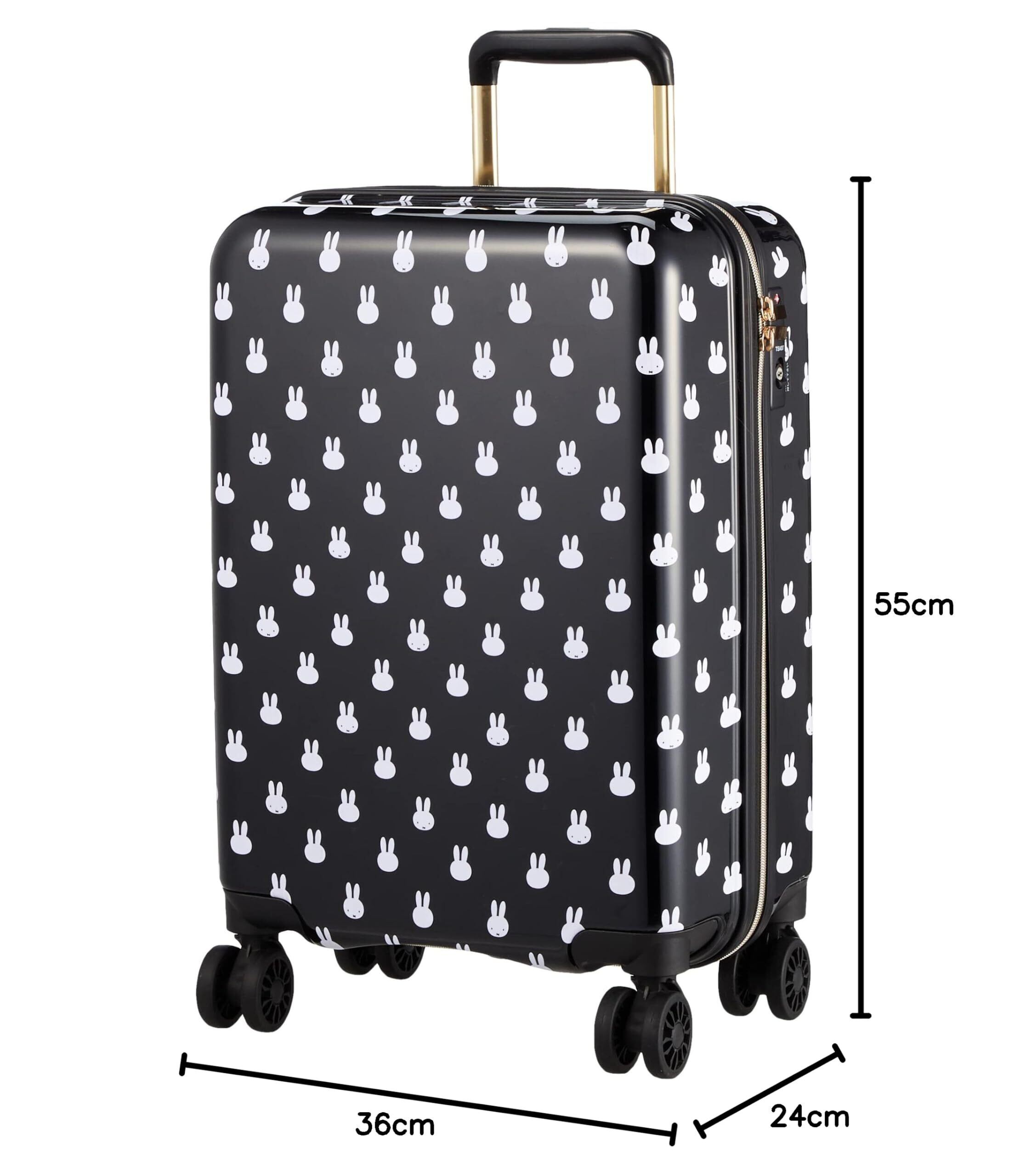 ボディには剛性・耐衝撃性などに優れた『ABS樹脂』に加え、表面を飛行機の窓などにも使われている軽量&頑強素材『ポリーカーボネート』も使用。軽さと頑強さを両立しました。安定性抜群のダブルキャスターに高級感溢れるゴールドキャリーバーも搭載。ミッフィーの可愛さに加え、嬉しい機能満載でファンにはたまらない一品です。