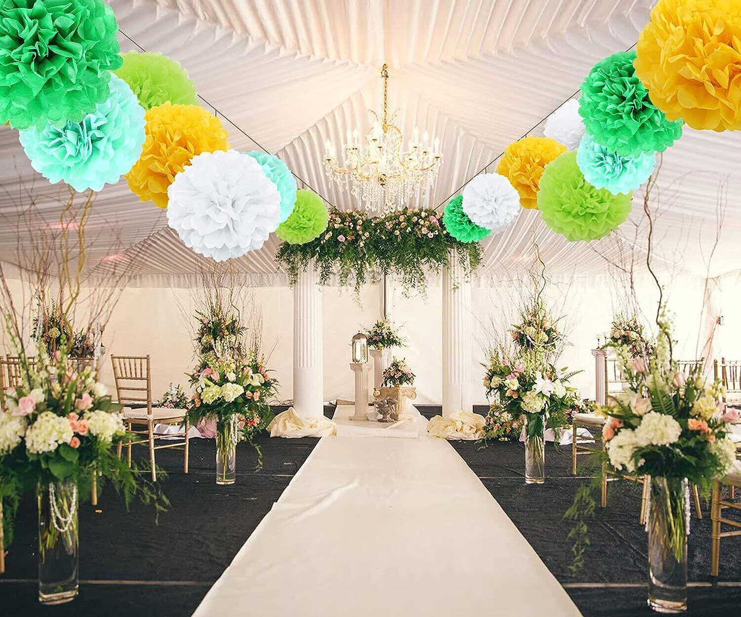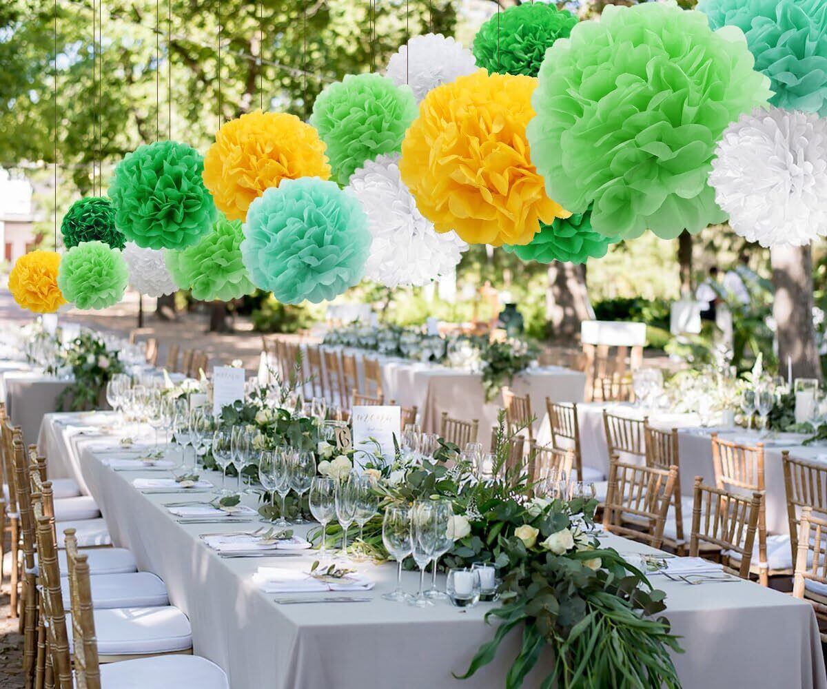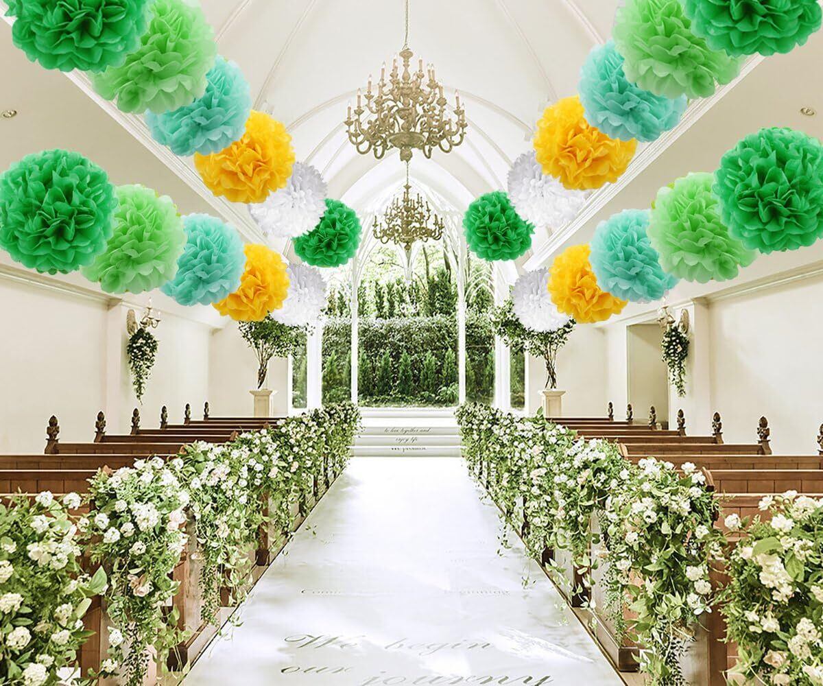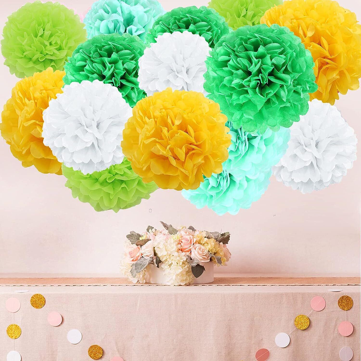 【パッケージ内容】緑黄系、ふわふわなフラワーボールとペーパーランタンの組み合わせアクセサリー、程よい美しさをもたらします。