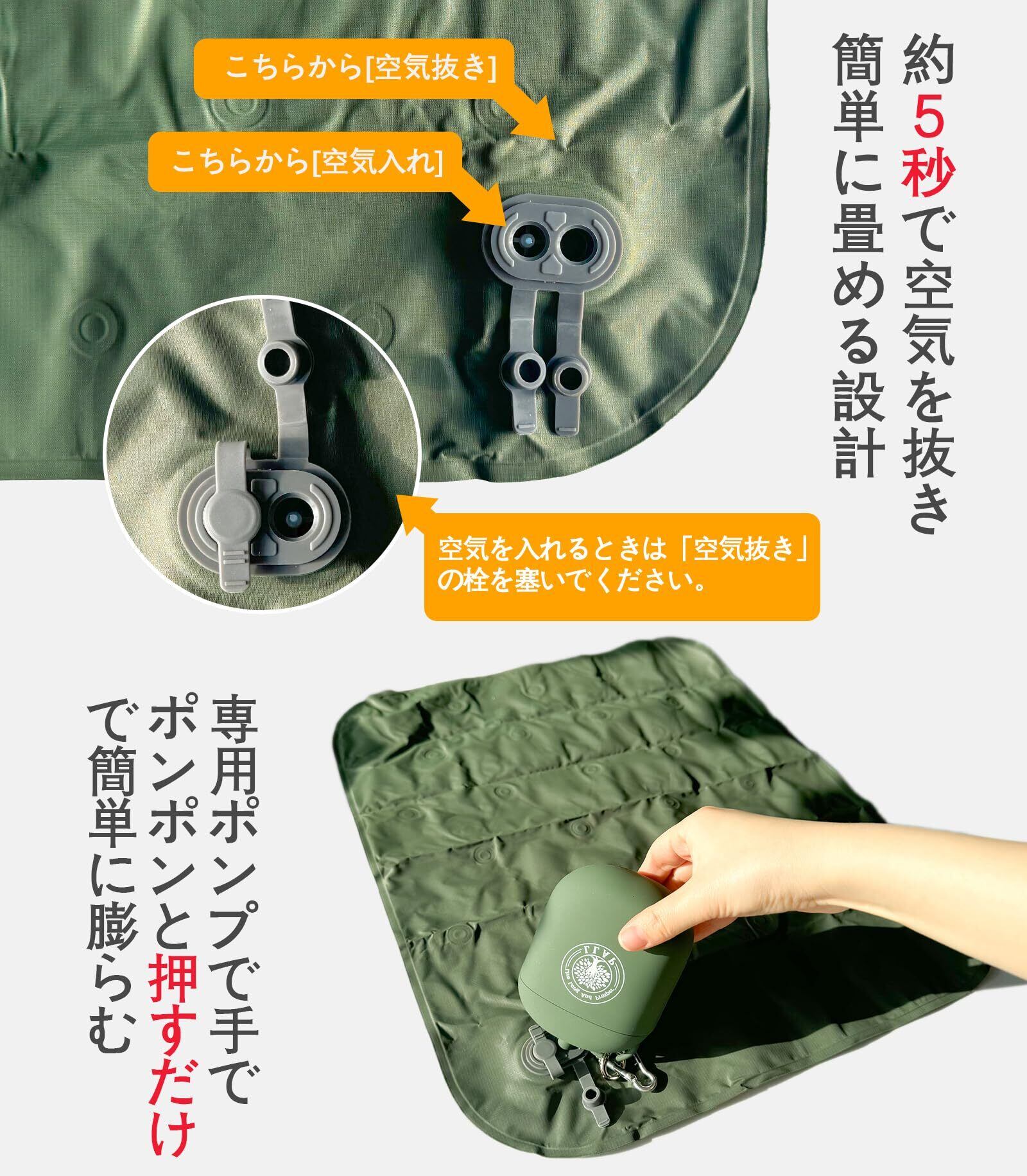 【約5秒で空気を抜き簡単に畳める設計】ミニバルブ内のボタンを押すと簡単に空気を排出できる。片付けも簡単、付属の収納ケースに入れれば、持ち運びも楽々。