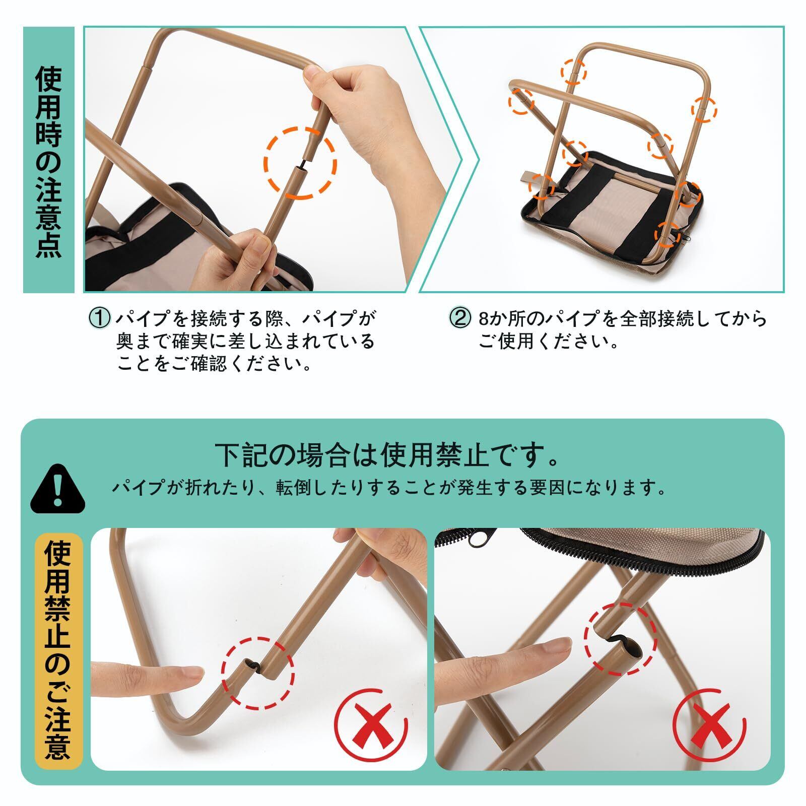 【注意事項】 ①組み立て・収納の際、指や手などを挟まらないようご注意ください。特にお子様のみでの組み立てや収納をお控えください。 ②パイプの8か所の接続部を奥まで確実に差し込んでから本製品をご使用ください。
