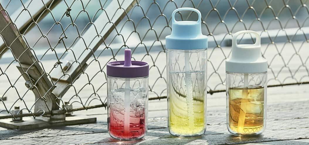息抜きをしながら、穏やかな時間を楽しむ人に向けたTO GO BOTTLE。 浮遊感を楽しめる二重構造のボトルは、氷が溶けにくく冷たさを長くキープします。飲み口は柔らかいシリコーン素材で口当たりの良いストロータイプ。 蓋は手にフィットして持ちやすいハンドル付きで、気軽に持ち歩けるデザインです。