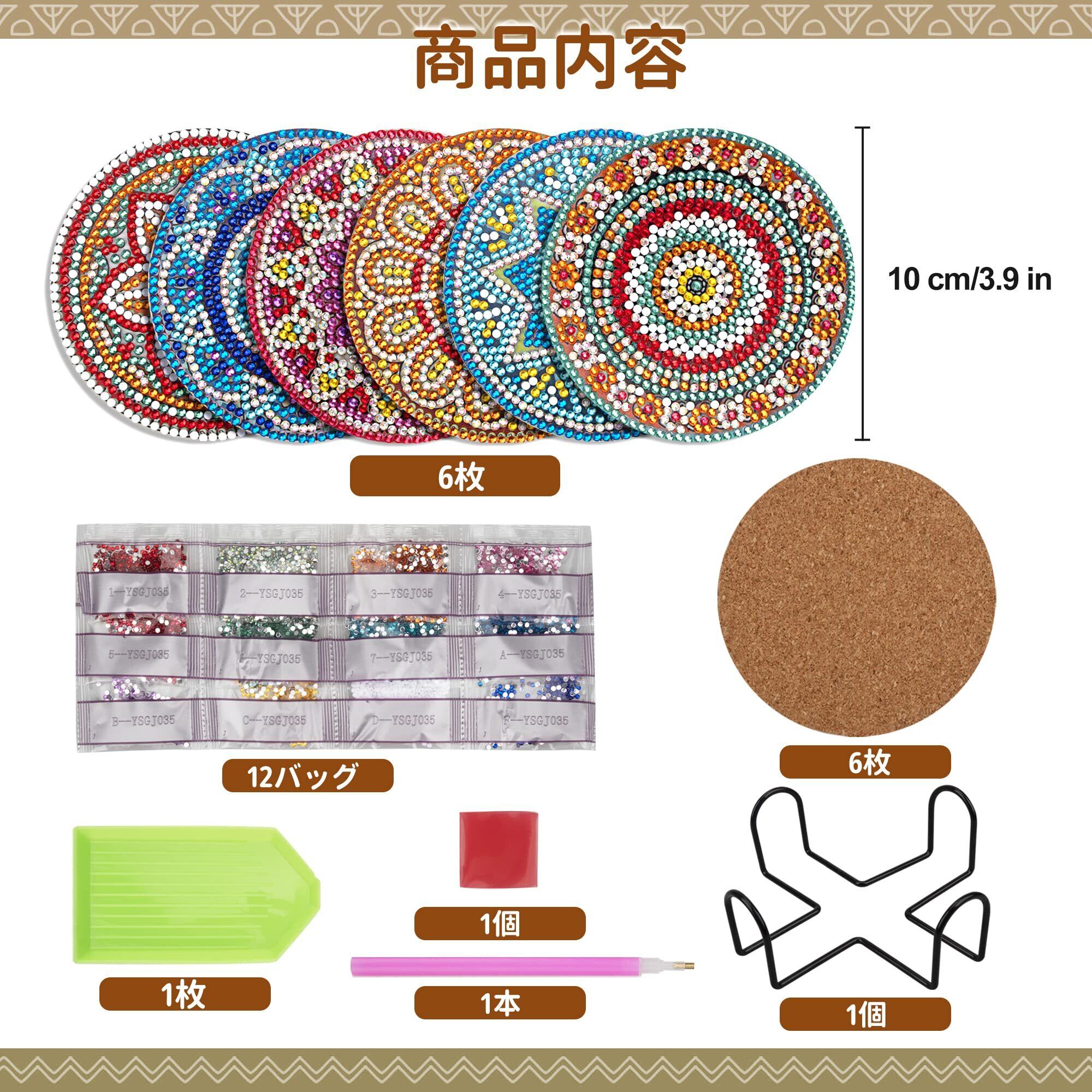 【パッケージ内容】ダイヤモンドアート・コースター*6枚、ダイヤモンドビーズ*12バッグ、コルクマット*6枚、トレイ*1枚、グルー*1個、ダイヤモンド専用ペン*1本、収納ケース*1個