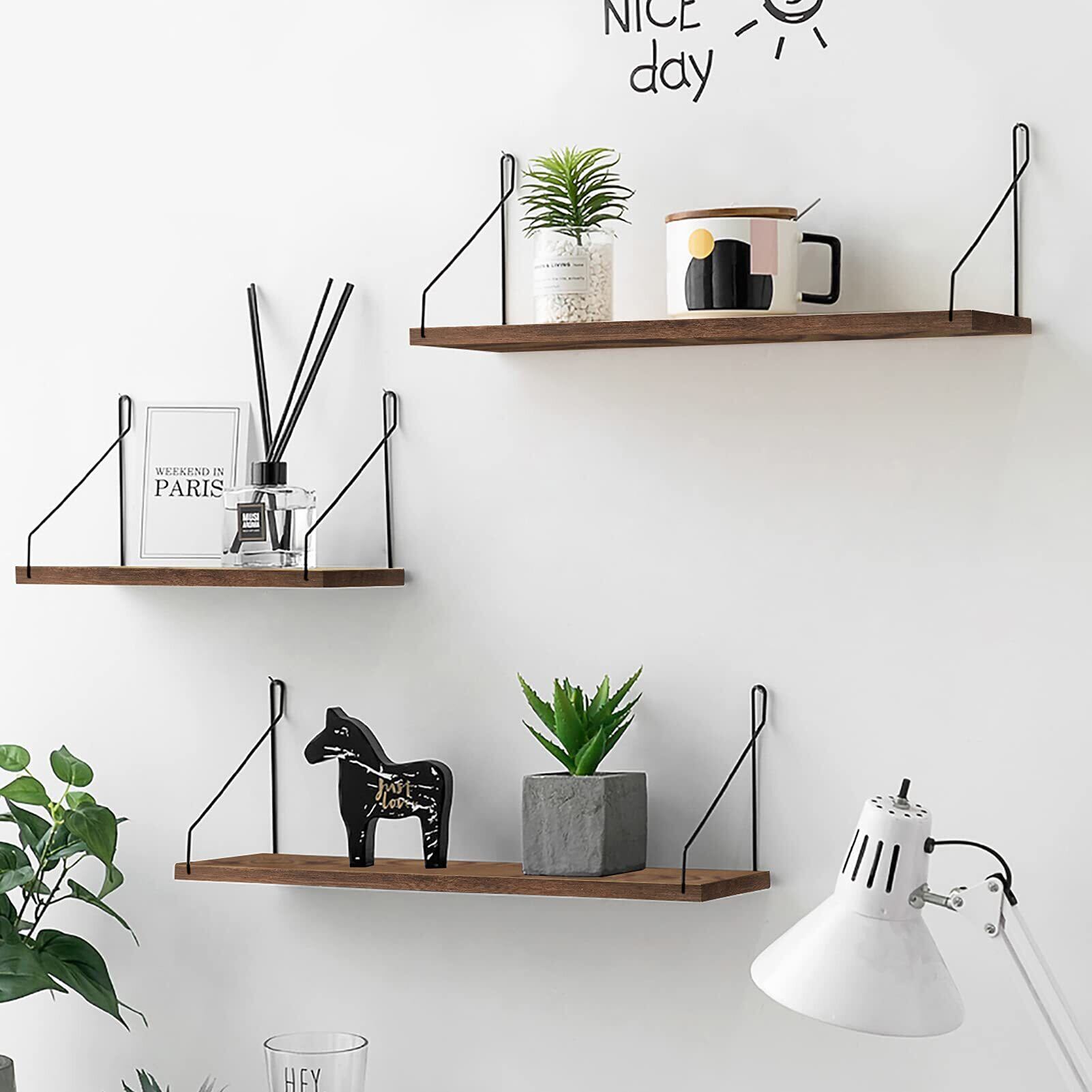 【在庫処分】ウォールシェルフ 天然木 壁掛け棚 取付簡単 本棚 DIY 木製 飾り棚 シンプル ワイヤー付け 収納便利 (ブラウン, 35cm)
