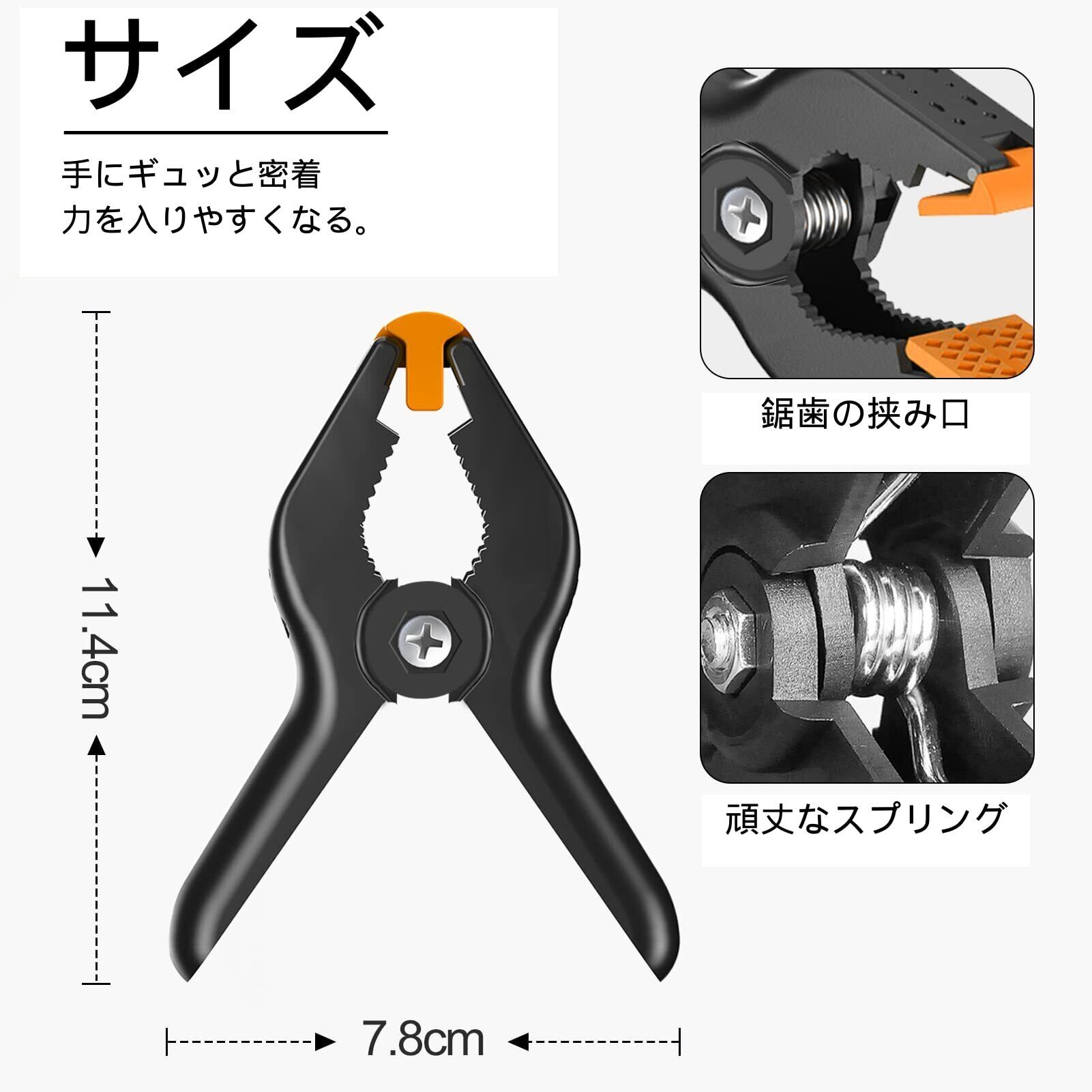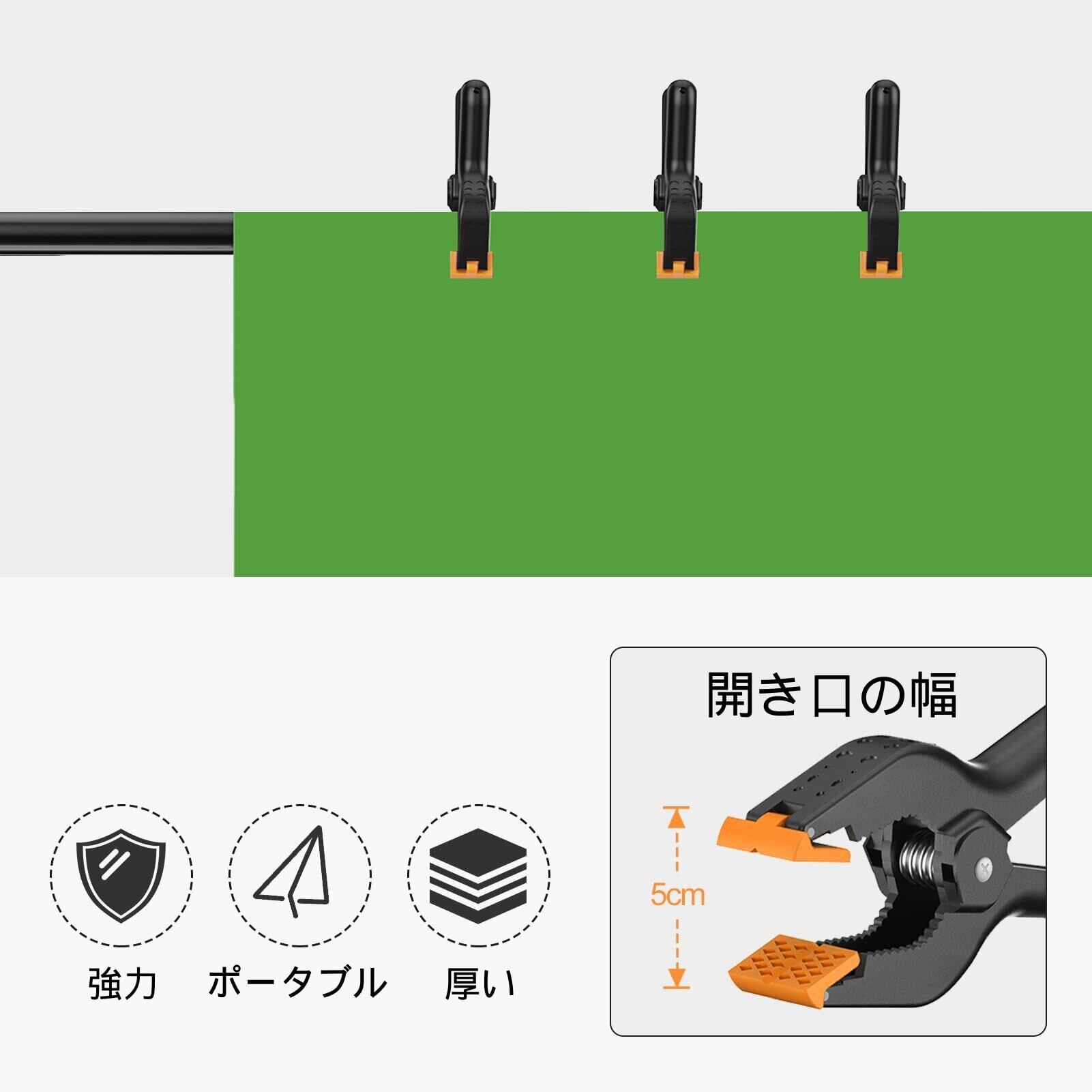 【クリップのサイズ】長さ約11cmの強力クリップの最大の開き口は約5cmで、ハンドルの幅は約7.8 cmです。他のスプリングクリップよりも大きなものです。さまざまなサイズの背景布や背景スタンドに適しています。人間工学に基づき、力を入れやすいし、手に優しいです。