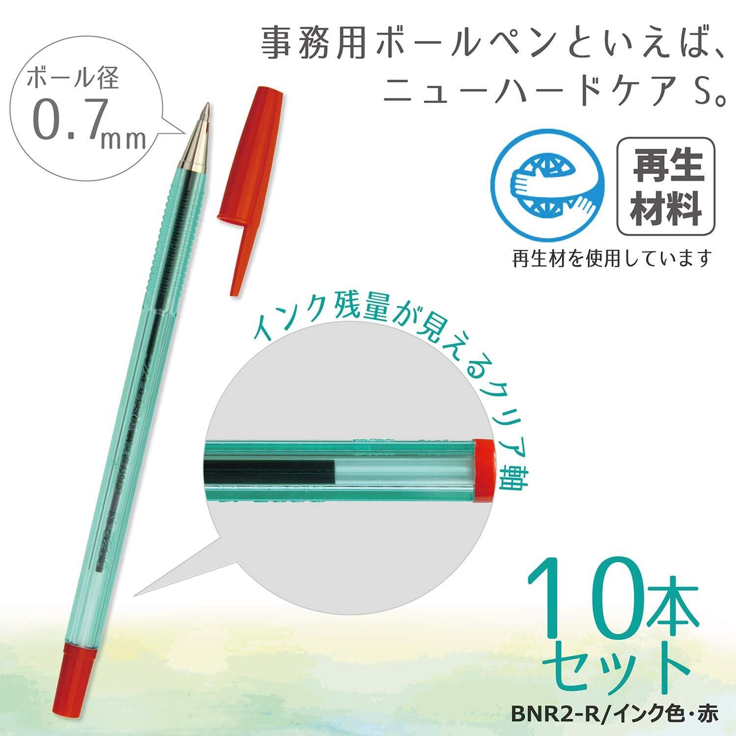 【商品名】 ゼブラ 油性ボールペン ニューハードケアS 赤 10本 B-BNR2-R 【商品説明】 【ニューハードケアS】キャップ式ボールペン 【仕様】軸・キャップ:樹脂 【インク】油性染料/赤インク 【替芯】H-0.7芯 【本体サイズ】最大軸径10×150.5mm/重量7.9g 【入数】10本入り ゼブラのロング定番油性ボールペンのニューハードケアS! 事務用はもちろん、伝票等の複写に最適。 クリアな軸のためインク残量がそのまま見える。 エコマーク認定商品。