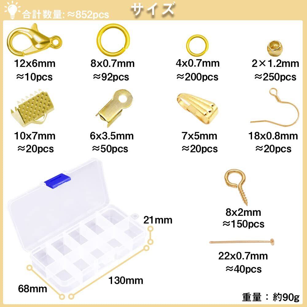 金具セット 10種 アクセサリーパーツ 約852個 基礎パーツ セット ハンドメイド 金具パーツセット ハン ドメイド材料 ケース付き DIY 手芸用品 ピアス/ブレスレット/ネックレスなど (金色)