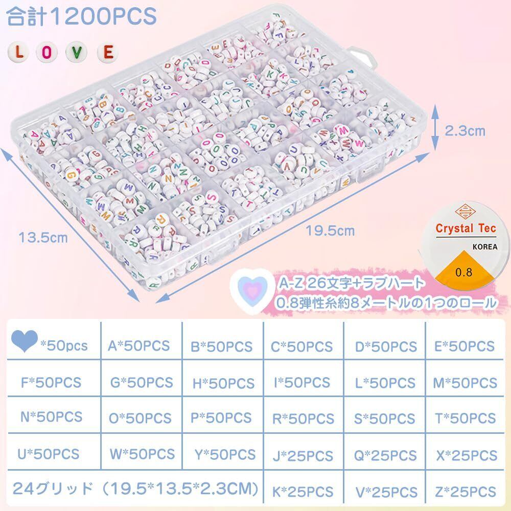 セット内容:アルファベットビーズセット 1200PCS(A-Z 26文字+ラブハート、合計約1200PCS)0.8弾性糸約8メートル1巻 製品重量:4*7mm ラウンド270g/セット 梱包サイズ:24区画 収納箱:19.5*13.5*2.3CM 材質:プラスチック/樹脂