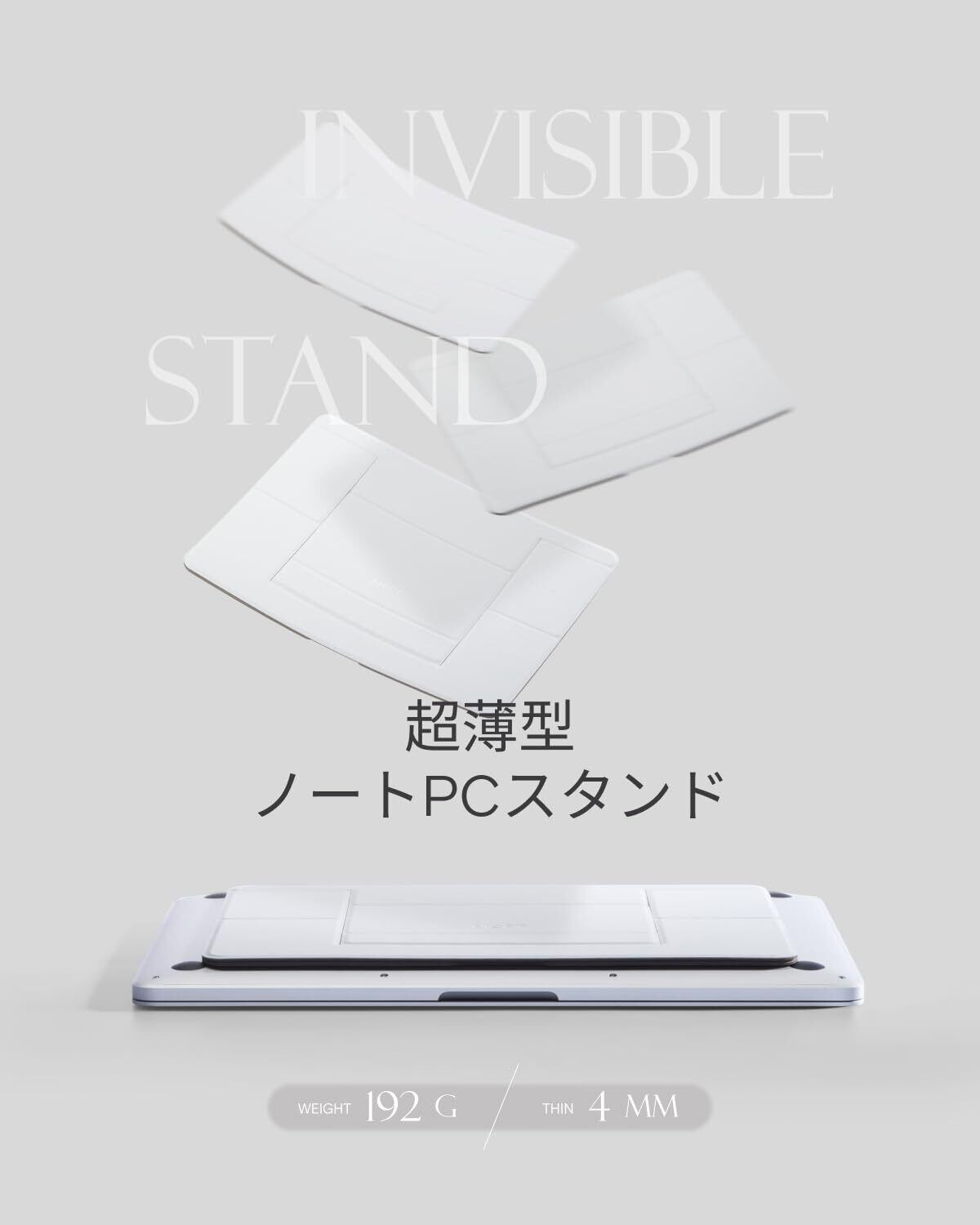 『軽くてスリム、持ち運び便利』このノートpcスタンドは紙のように薄く、コインのように軽く、重さ192g、厚さ4mmの超軽量設計でカバンに入れてもかさばらず、まるで持ち歩いていないかのような感覚です。会社や在宅でデスクワークをしても、外出先での作業も、快適にこなせます。あなたのワークスタイルをもっと自由に、もっと身軽に。