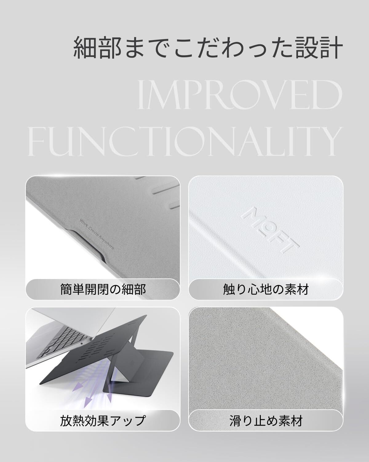 『一瞬で快適なワークスペースに』MOFTノートパソコンスタンドは、わずか一瞬でどこでも、どんな場所でも、快適なワークスペースを創出します。世界最薄クラスの折りたたみ式デザインは、カバンにすっぽり収まり、いつでもどこでも、あなたのオフィスへ変身。テレワーク、カフェ、移動中など、場所を選ばず、快適なタイピング体験をお届けします。