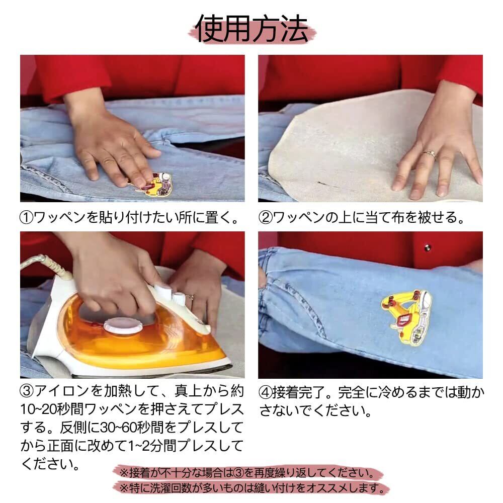 【接着手順】①ワッペンを貼り付けたいところに置く。②ワッペンの上に当て布を被せる。③アイロンを加熱して真上から10~20秒間ワッペンを押さえてプレスしてください。反側に30~60秒間をプレスしてから正面に改めて1~2分間プレスしてください。