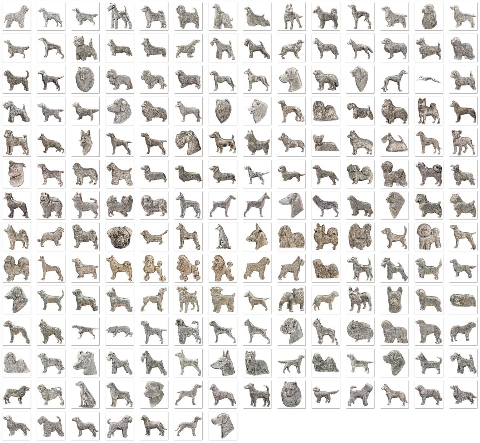 製品の多くは当時のイギリスのデザイナー職人の手によってデザインされ、どの犬種のアイテムもとても精巧で芸術的センスの高い本格的な造りとなっていて、品のあるシルバー色、ゴールド色を帯びたこれらの製品は どの毛色の犬の飼い主様であっても 違和感なく使う事ができると 本国であるイギリスでは高い人気を誇っています。
