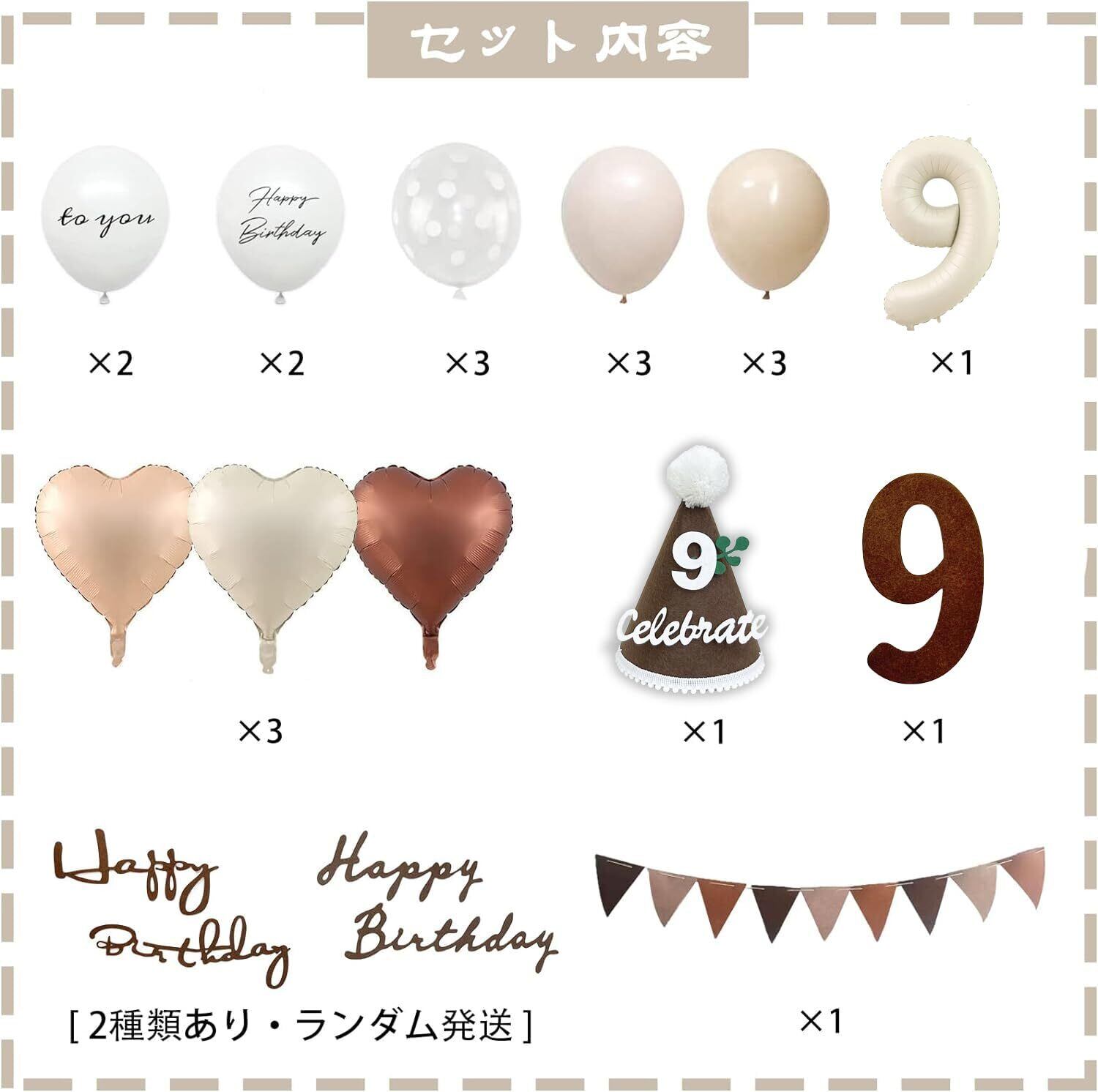 【セット内容】①ゴム風船×13(Happy Birthday × 2、TO YOU × 2、グレージュ× 3、肌色× 3、クリアドット× 3) ②ハートバルーン×3(クリーム色×1、肌色×1、チョコレート色×1) ③数字バルーン×1 ④三角帽子×1 ⑤フェルトの三角旗ガーランド×1 ⑥フェルト数字 ⑦フェルトアルファベット(2種類あり・ランダム発送) ⑧両面テープ