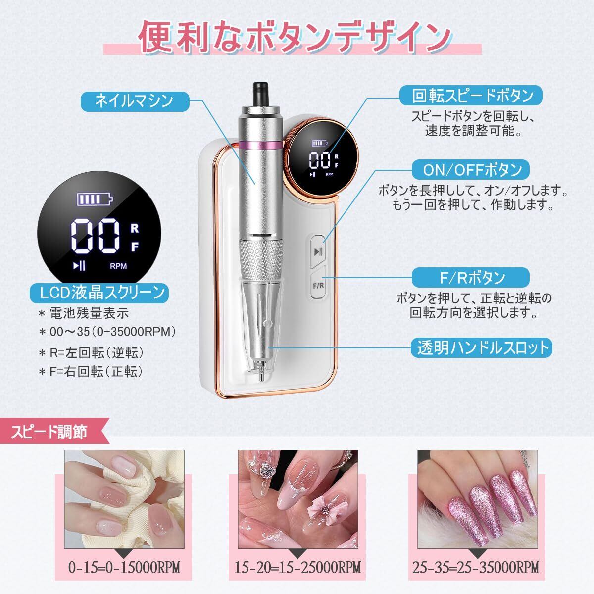 【35,000RPM無段階調整可能&正逆回転機能付き】電動ネイルドリルは、自分の習慣や粗い研削から細かい研削まで必要に応じて、回転スピードが0〜30000rpmのの無段階速度調整が可能です。正逆回転機能がついており、左右どちらの利き手の人でも使用することができます。初心者にうれしいひと目で回転数が分かる目盛りがポイント。