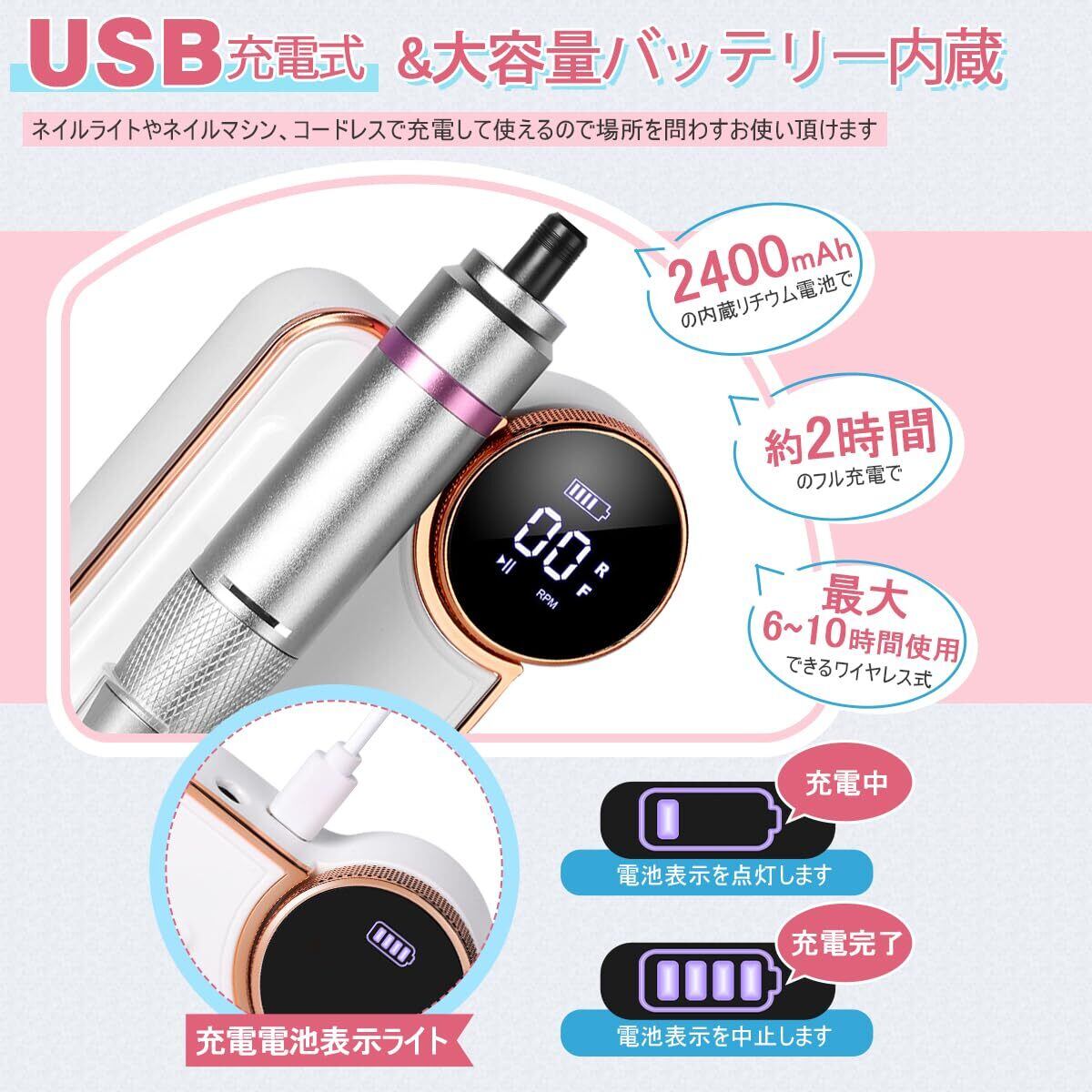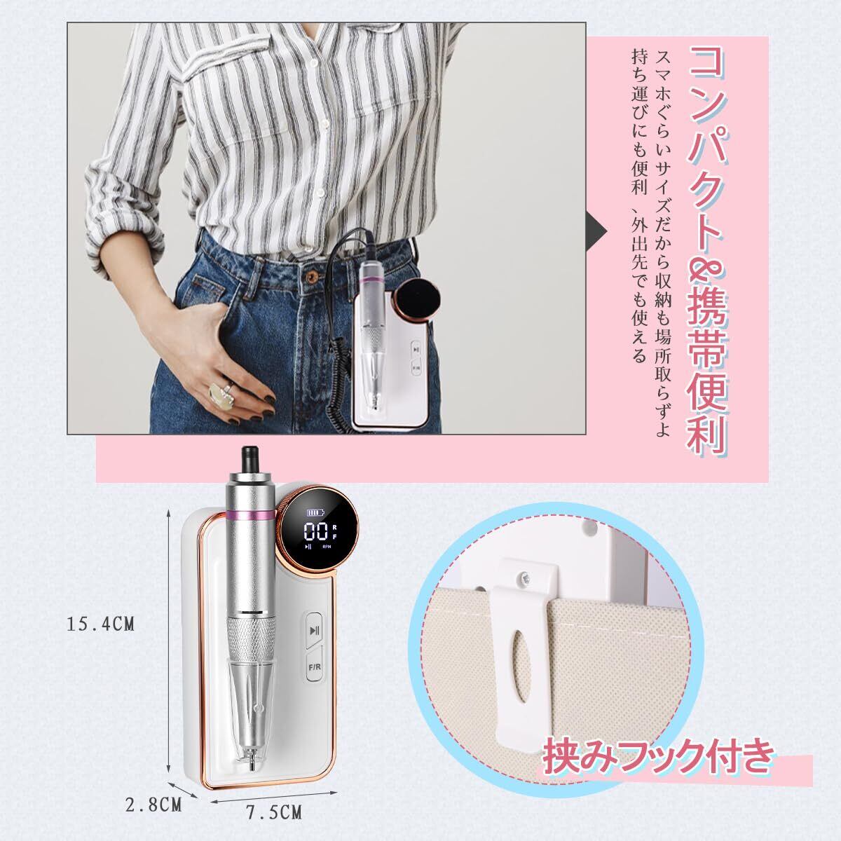 【USB充電式&コードレス便利」USB充電式ネイルマシンは 大容量バッテリー内蔵で、完全に充電されるまでの時間は、2-2.5時間充電するだけで6-10時間使用できます。電量不足の心配やケーブル長さの制限から解放して、コードレス電動ネイルドリルは一層利用便利になります。スマホぐらいのコンパクトサイズで、収納も場所取らずよ 、フックが付いているので、携帯便利性がもっと高いです。コードレスで、旅行、出張や自宅、どこでも使用できます。安定した動作で手ブレしにくい点は好印象です。