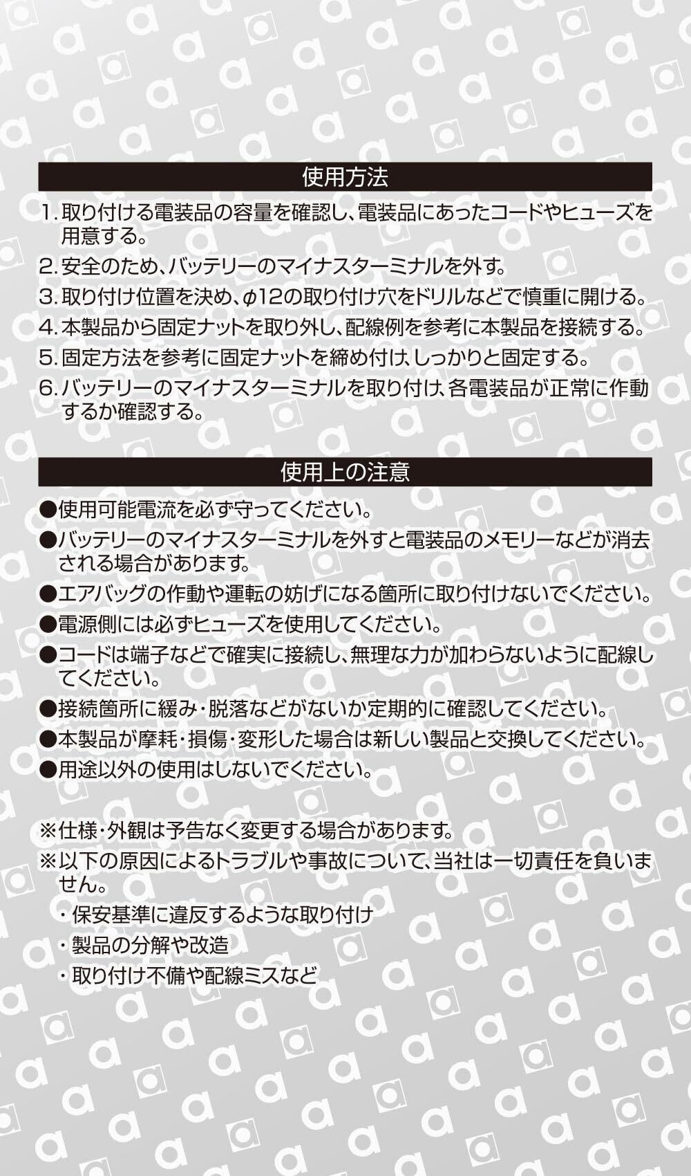 使用可能電流:DC12V車・20A以下/DC24V車・10A以下