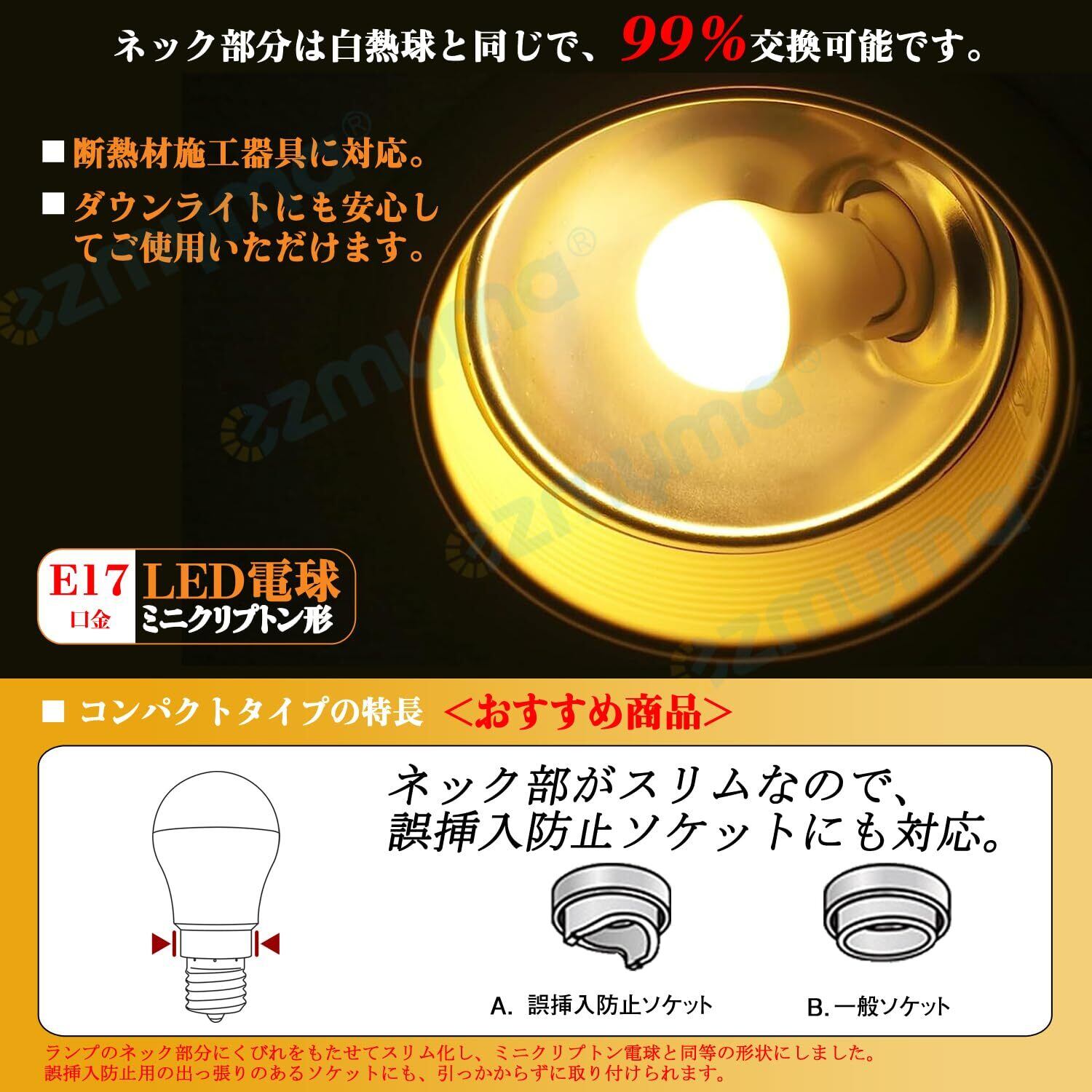PSE認証済み,5年間の。断熱材施工器具対応、 屋外用器具への取り付け対応、 調光器対応:X
