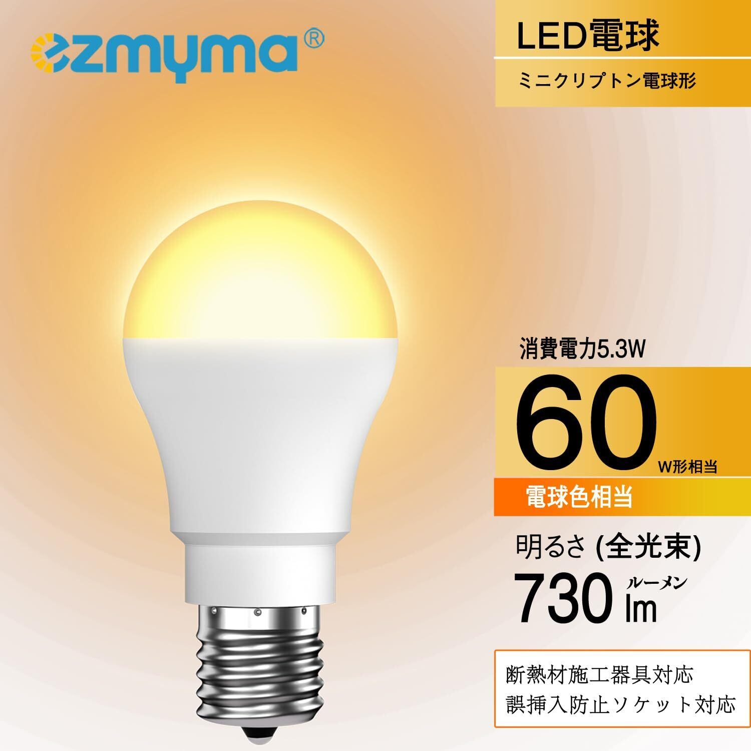 ミニクリプトン電球 LED電球 口金直径17mm 電球色 60W形相当 広配光 2個セット 730lm 断熱材器具対応