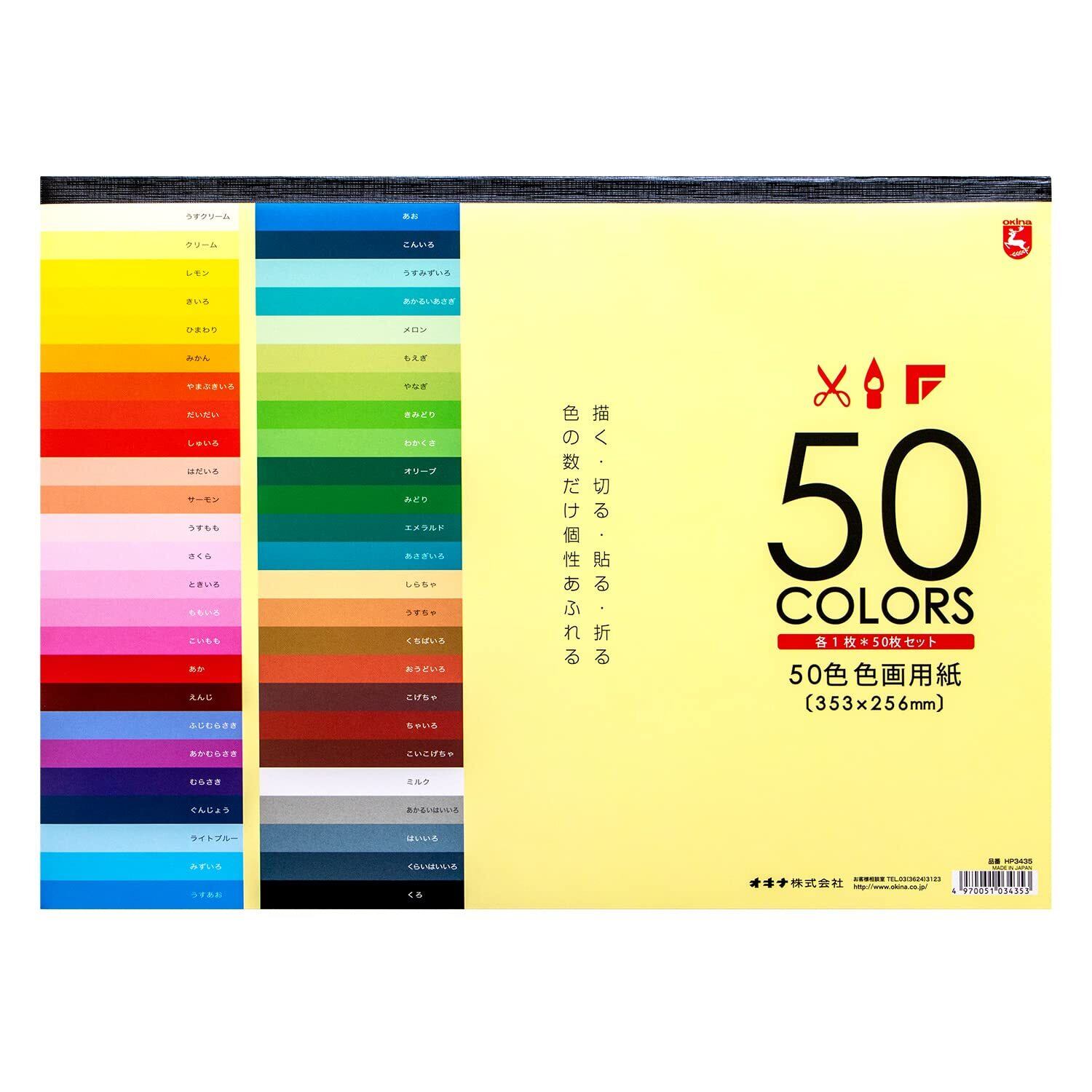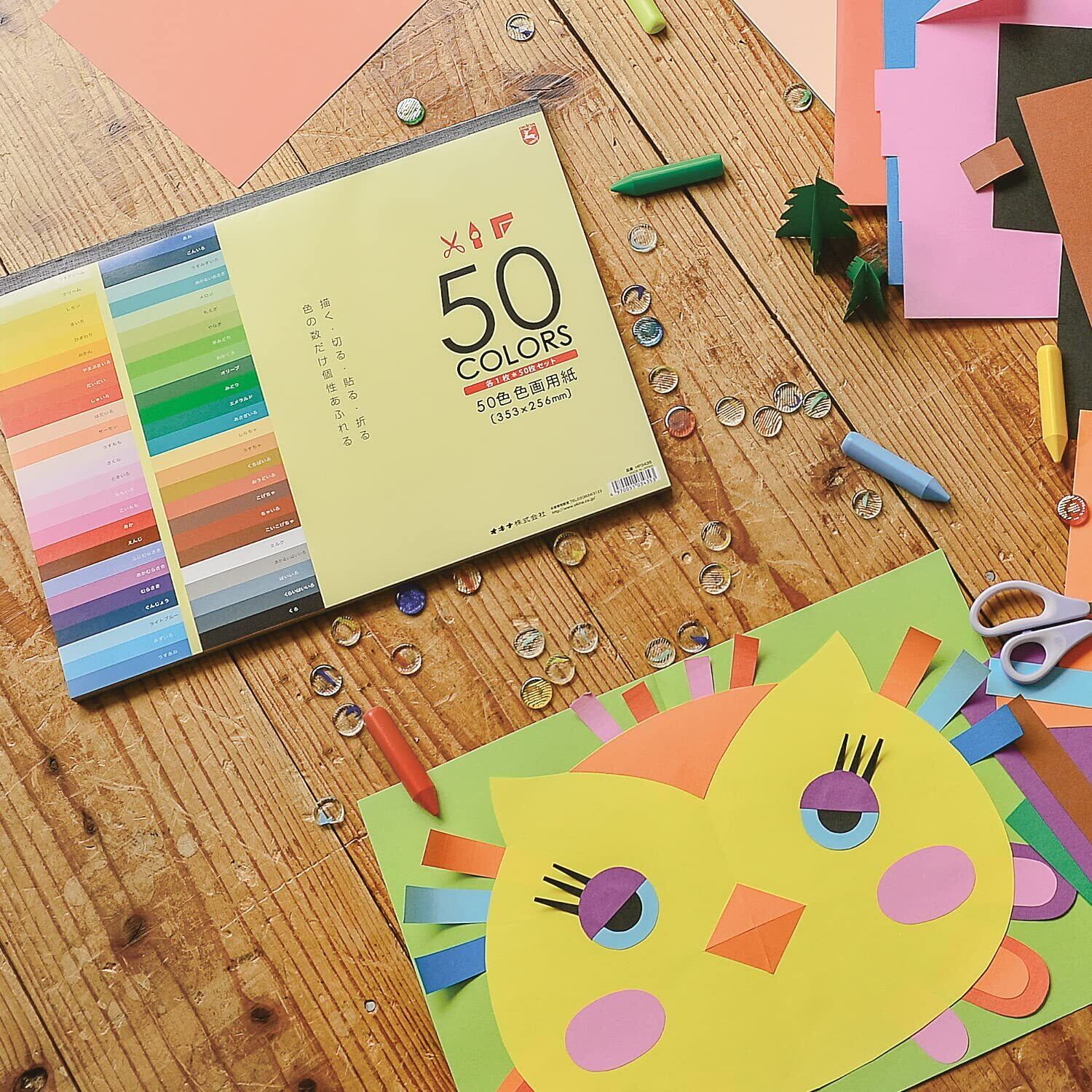 50色の色画用紙を1枚ずつセット。353×256の大判サイズ。店頭では、あまり見る機会が少ない50色が揃った画用紙。