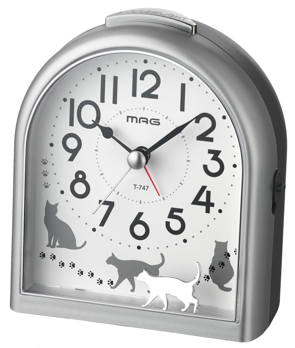 【努力特価】MAG(マグ) 目覚まし時計 置き時計 アナログ ねこ ネコ 動物 かわいい 子供 静音 連続秒針 電子音 アラーム スヌーズ ライト シルバー ミグレイト T-747 SM-Z ノア精密