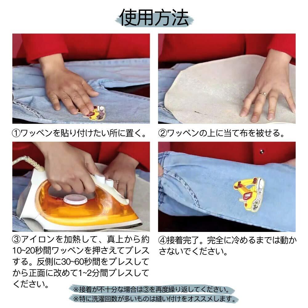 【接着手順】①ワッペンを貼り付けたい場所に置きます。②当て布をワッペンの上に被せます。③アイロンを加熱し、10~20秒間ワッペンを押さえてプレスします。裏側に30~60秒プレスしてから、再び表側に1~2分間プレスします。