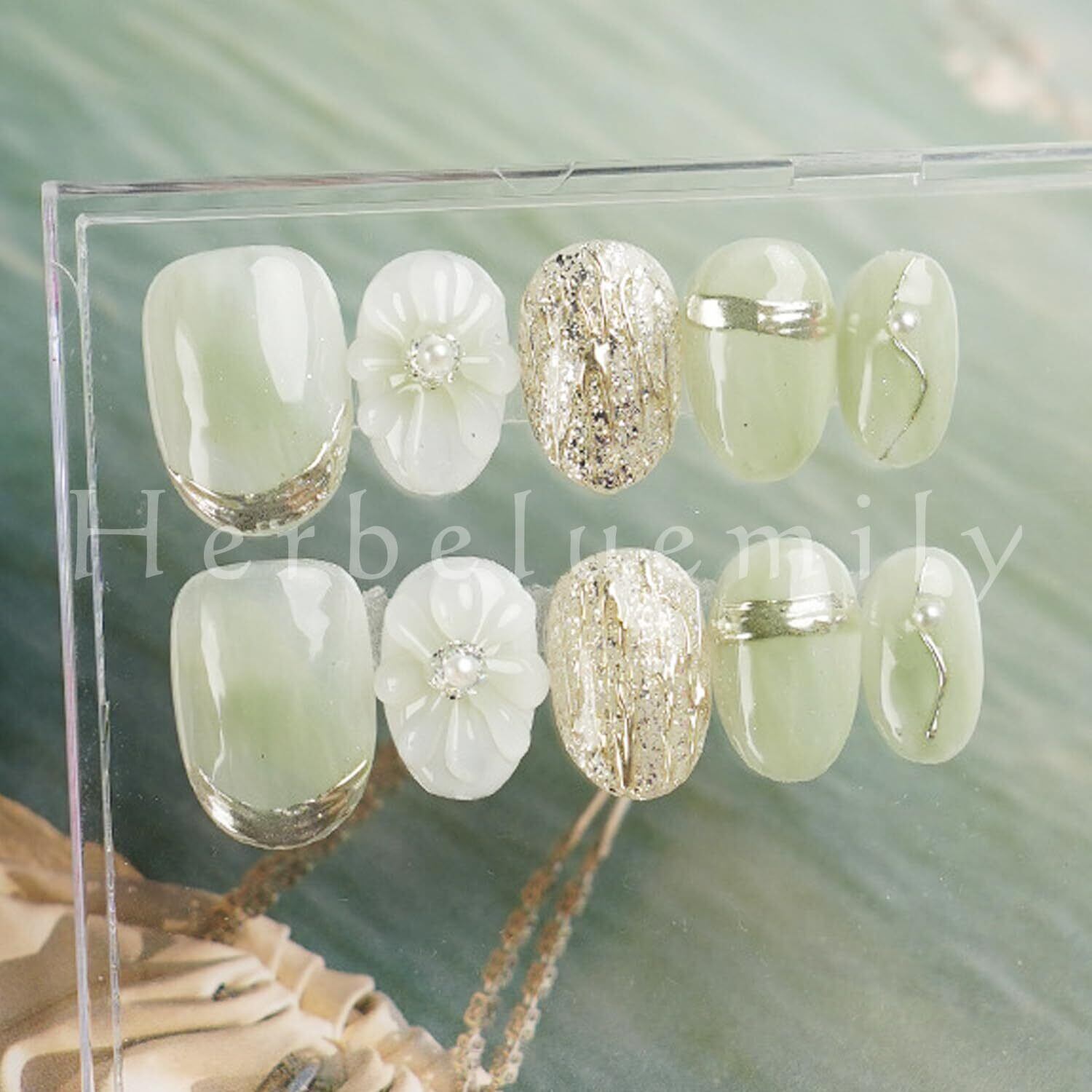 【人気】[Herbeluemily] ネイルチップ ショート 手作り 付け爪 3D 収納ケース 10枚入 フラワー マーメイド フラワーグリーン(オーバル) L HM-0098-R18-OVGR-L